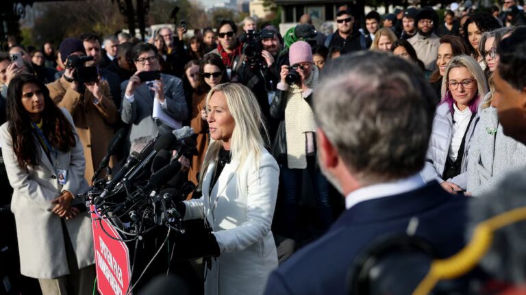3:55Rep. Marjorie Taylor Greene addresses attendees during a press briefing alongside Rep. Ro Khanna, Rep. Thomas Massie and survivors of Jeffrey Epstein’s abuse regarding the Epstein Files Transparency Act in front of the U.S. Capitol, November 18, 2025 in Washington.Anna…