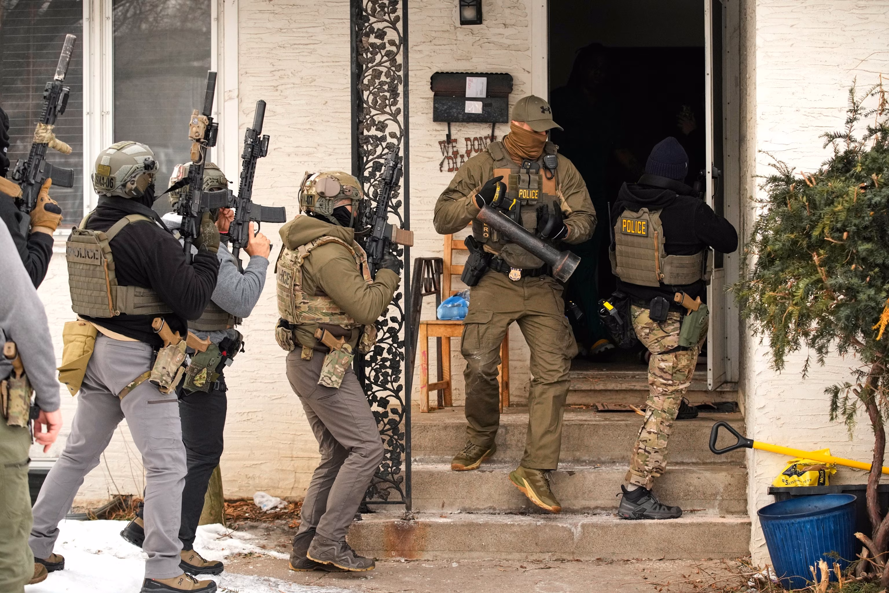 Federal immigration officers prepare to enter a home to make an arrest after an officer used a battering ram to break down a door, on Jan. 11, 2026, in Minneapolis.John Locher/AP
