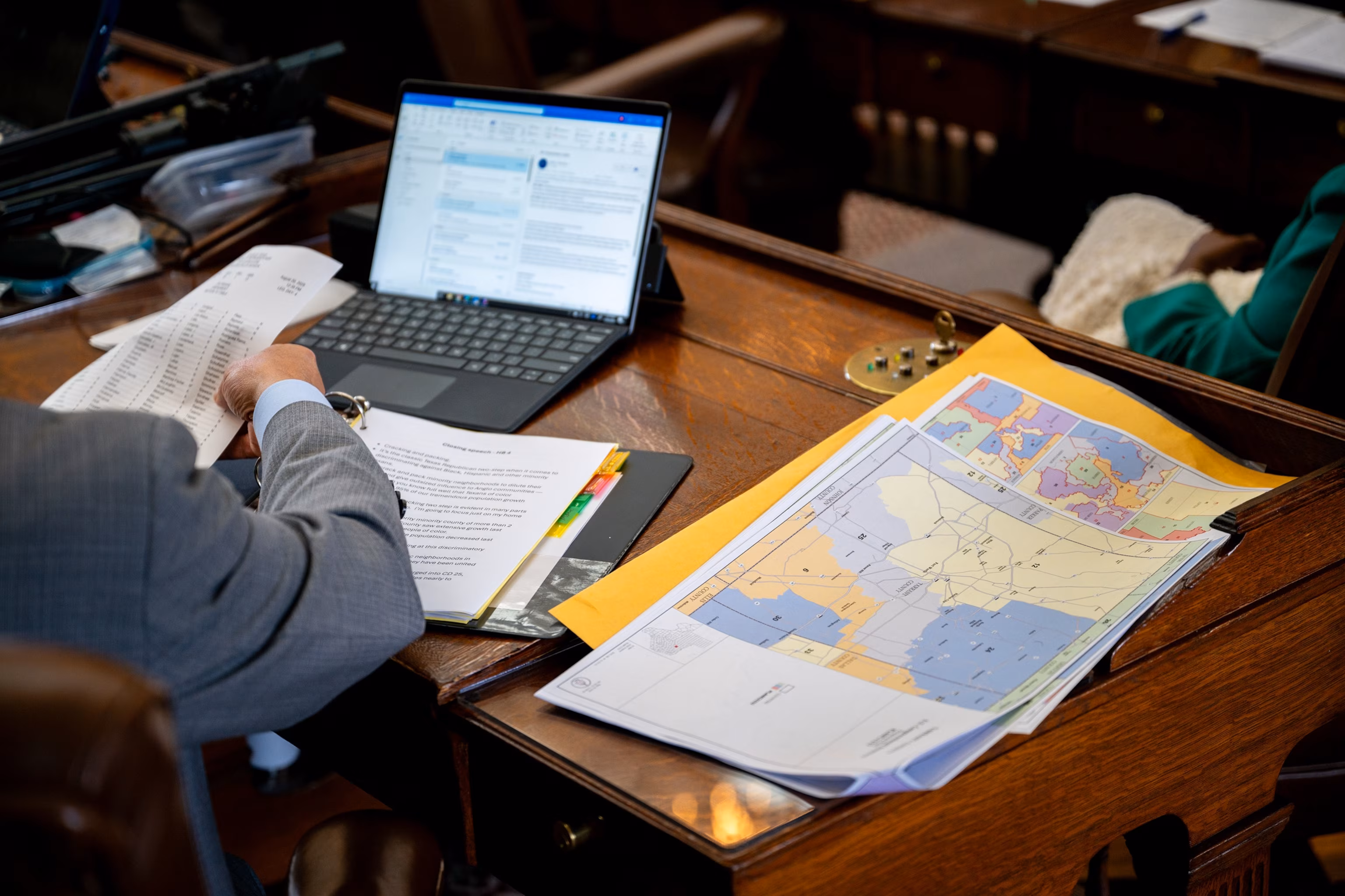 Maps are displayed on Texas Democratic Rep. Chris Turner’s desk during a House meeting in the State Capitol on August 20, 2025 in Austin, Texas.Brandon Bell/Getty Images