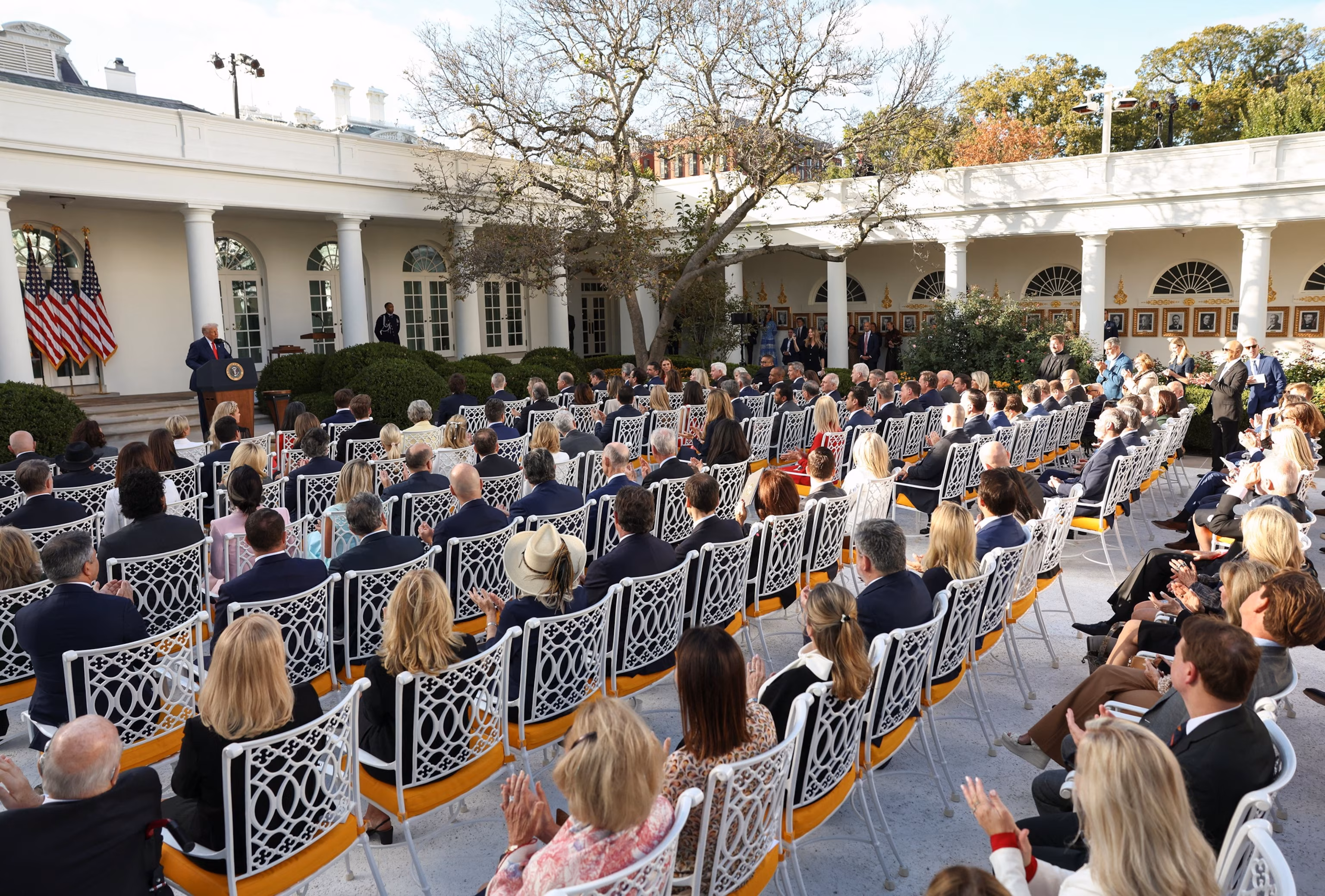 Republican Senators and other attendees occupy tables under umbrellas as President Donald Trump speaks while hosting a Rose Garden Club luncheon at the White House in Washington, October 21, 2025.Kevin Lamarque/Reuters