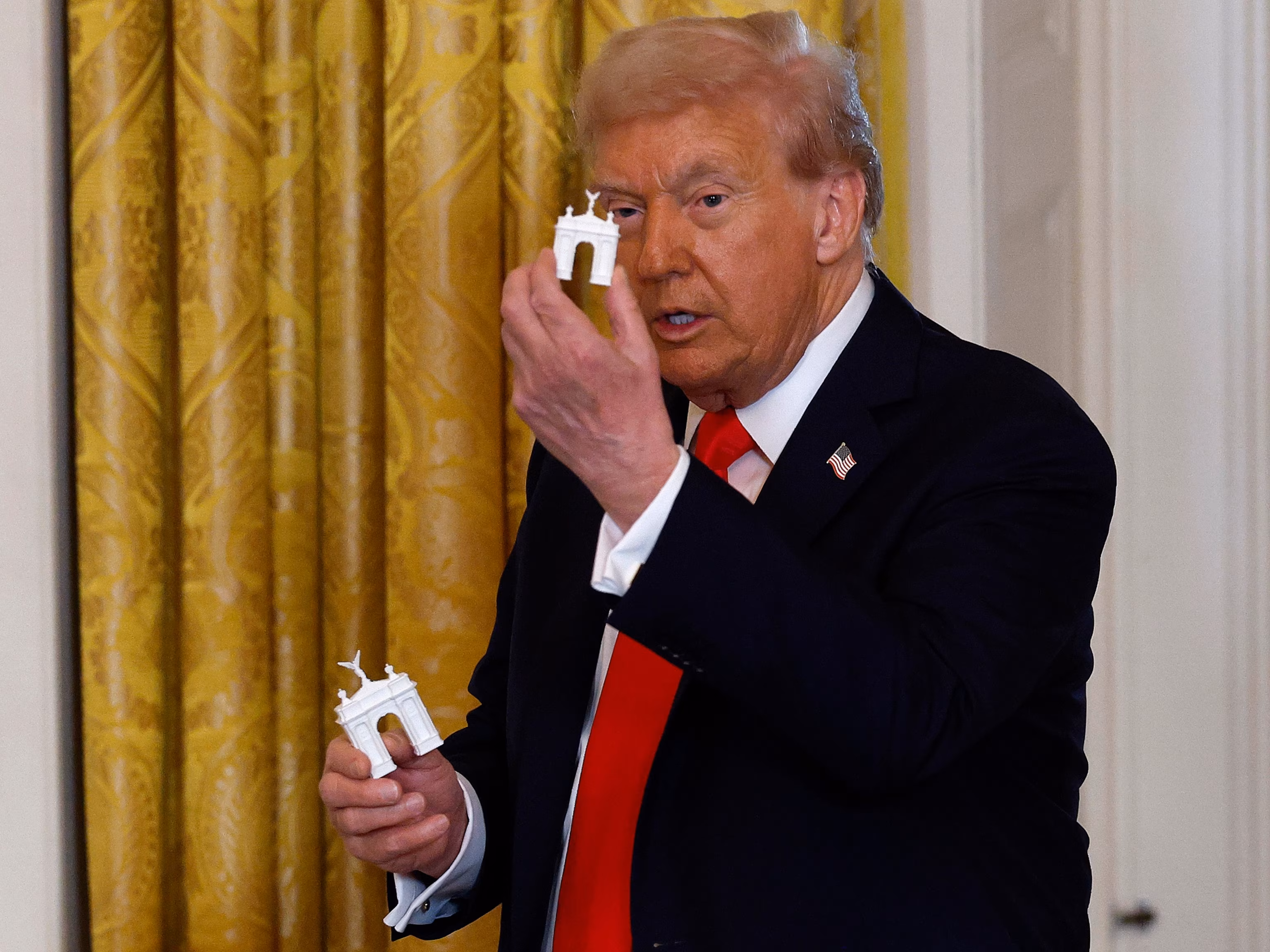President Donald Trump holds models of an arch as he delivers remarks during a ballroom fundraising dinner in the East Room of the White House, October 15, 2025 in Washington.Kevin Dietsch/Getty Images
