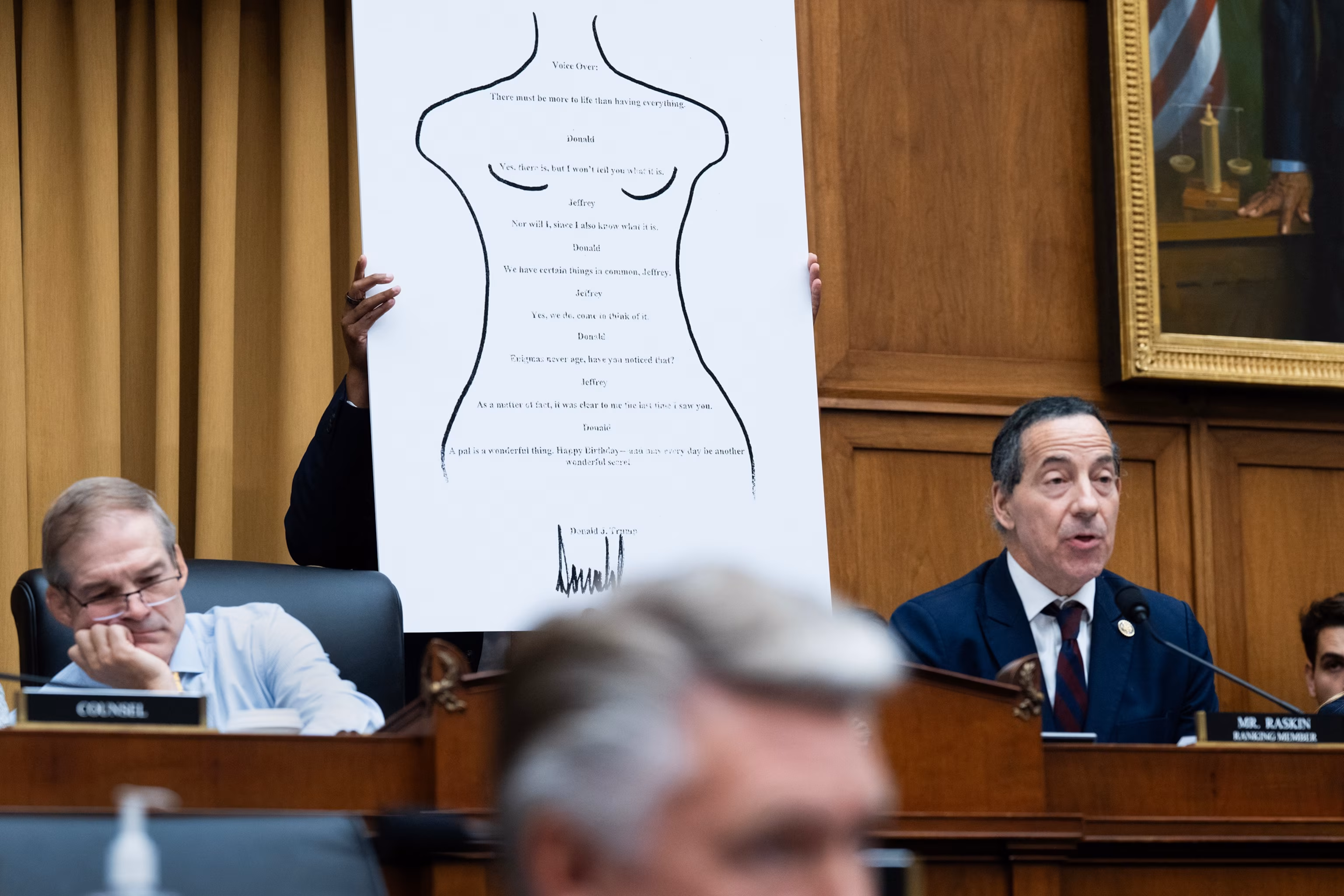 This archived photograph from Sept. 17, 2025, shows Rep. Jamie Raskin referencing what is said to be a drawing by Donald Trump created for Jeffrey Epstein’s 50th birthday, during a House Judiciary Committee meeting entitled “Oversight of the Federal Bureau of Investigation,” in the Rayburn building in Washington, D.C.Tom Williams/CQ-Roll Call, Inc via Getty Images, FILE