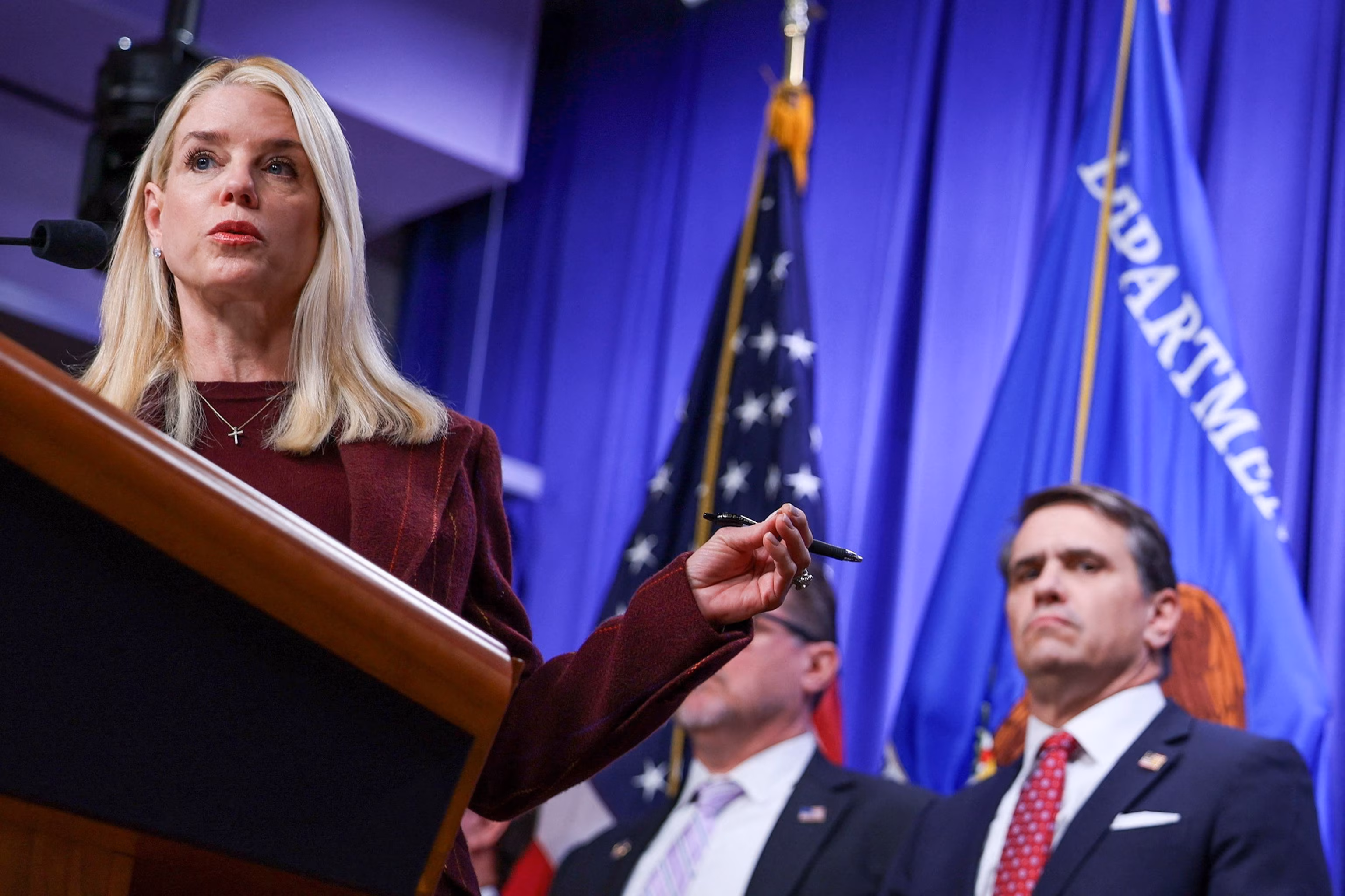 Attorney General Pam Bondi speaks during the announcement of a law enforcement action as Deputy Attorney General Todd Blanche listens during a press conference at the Department of Justice in Washington, November 19, 2025.Tom Brenner/Reuters