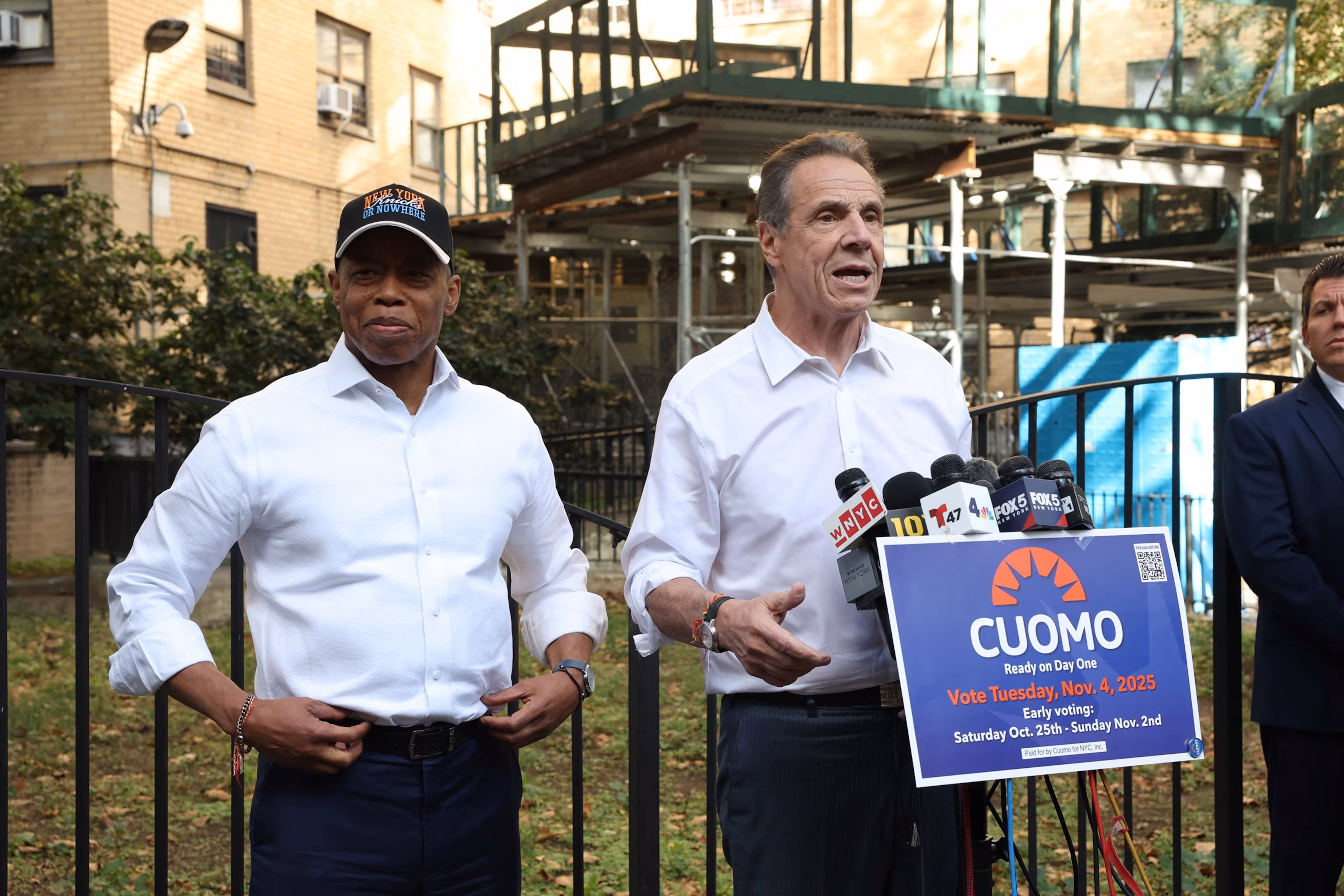 New York independent mayoral candidate Andrew Cuomo speaks next to mayor Eric Adams in New York on Oct. 23, 2025.Timothy A. Clary/AFP via Getty Images