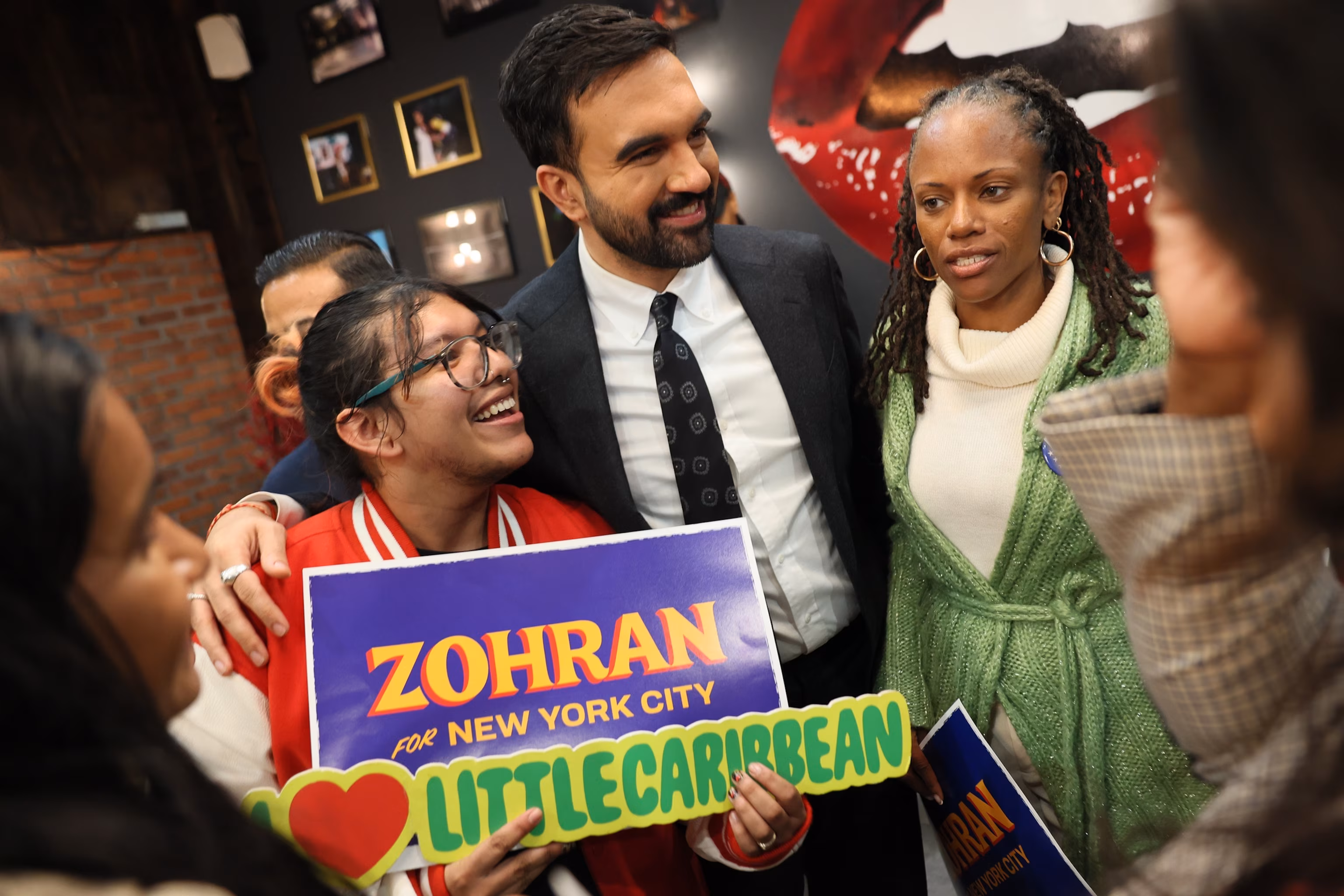 Democratic Mayoral Candidate Zohran Mamdani converses with supporters within Lips Cafe, Oct. 25, 2025, situated in the East Flatbush sector of the Brooklyn borough in New York.Michael M. Santiago/Getty Images