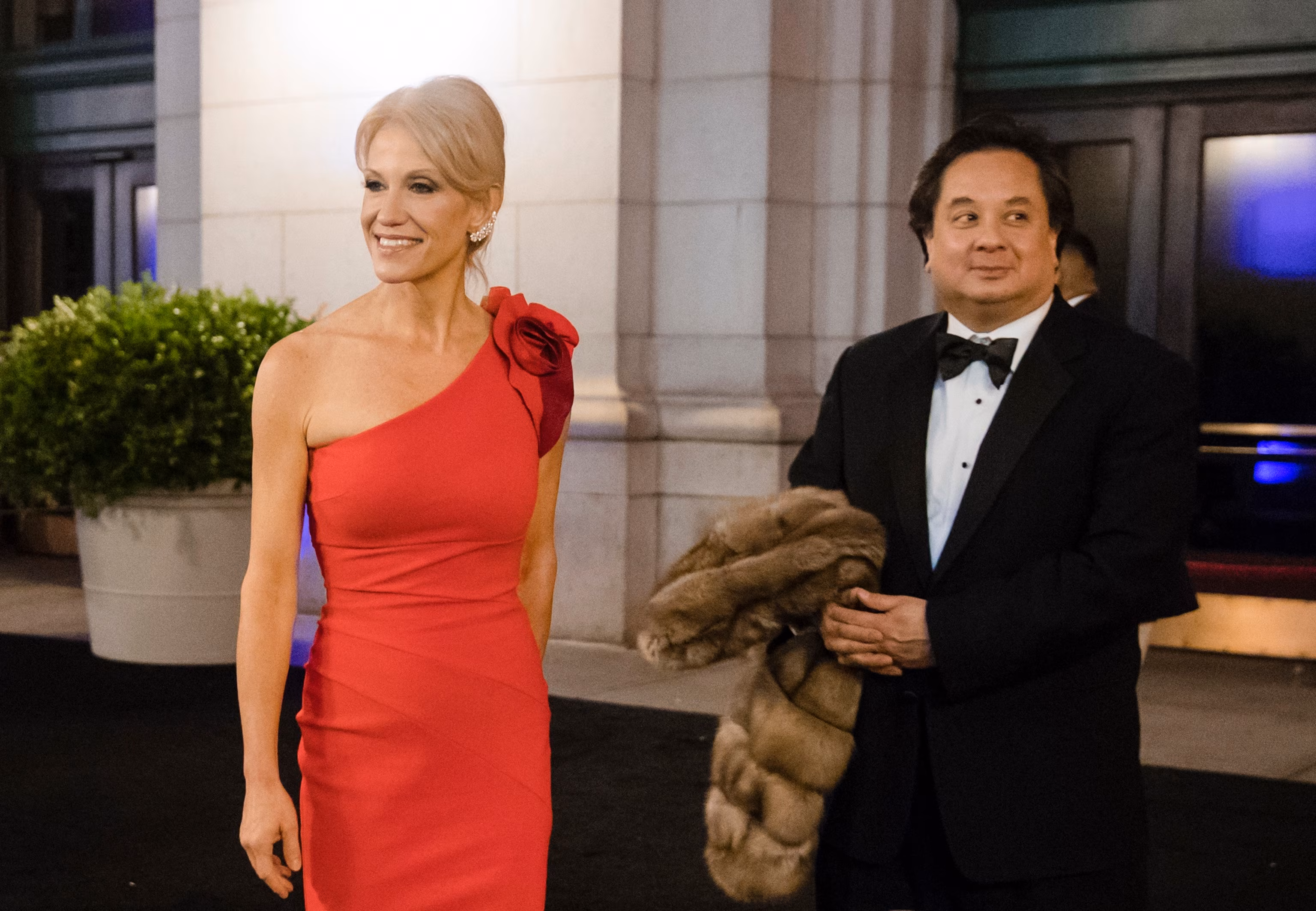 President-elect Donald Trump adviser Kellyanne Conway accompanied by her husband, George, speaks with members of the media as they arrive for a dinner at Union Station, Jan. 19, 2017, in Washington, D.C.Matt Rourke/AP