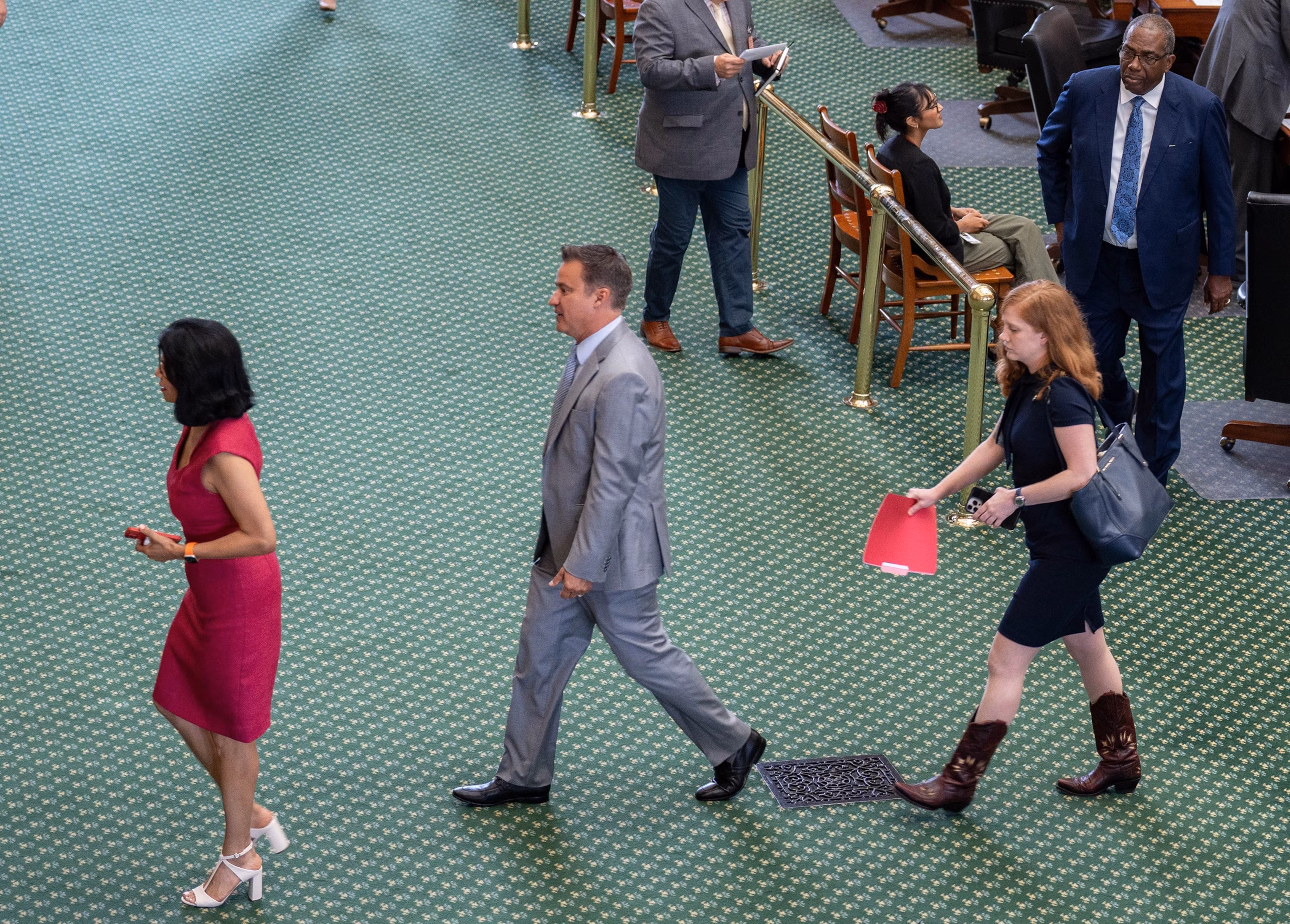In this Aug. 12, 2025, file photo, a group of Senate Democrats walk off the Senate floor as the redistricting bill is brought up at the Texas Capitol in Austin, Texas.Mikala Compton/Austin American-Statesman via Getty Images, FILE