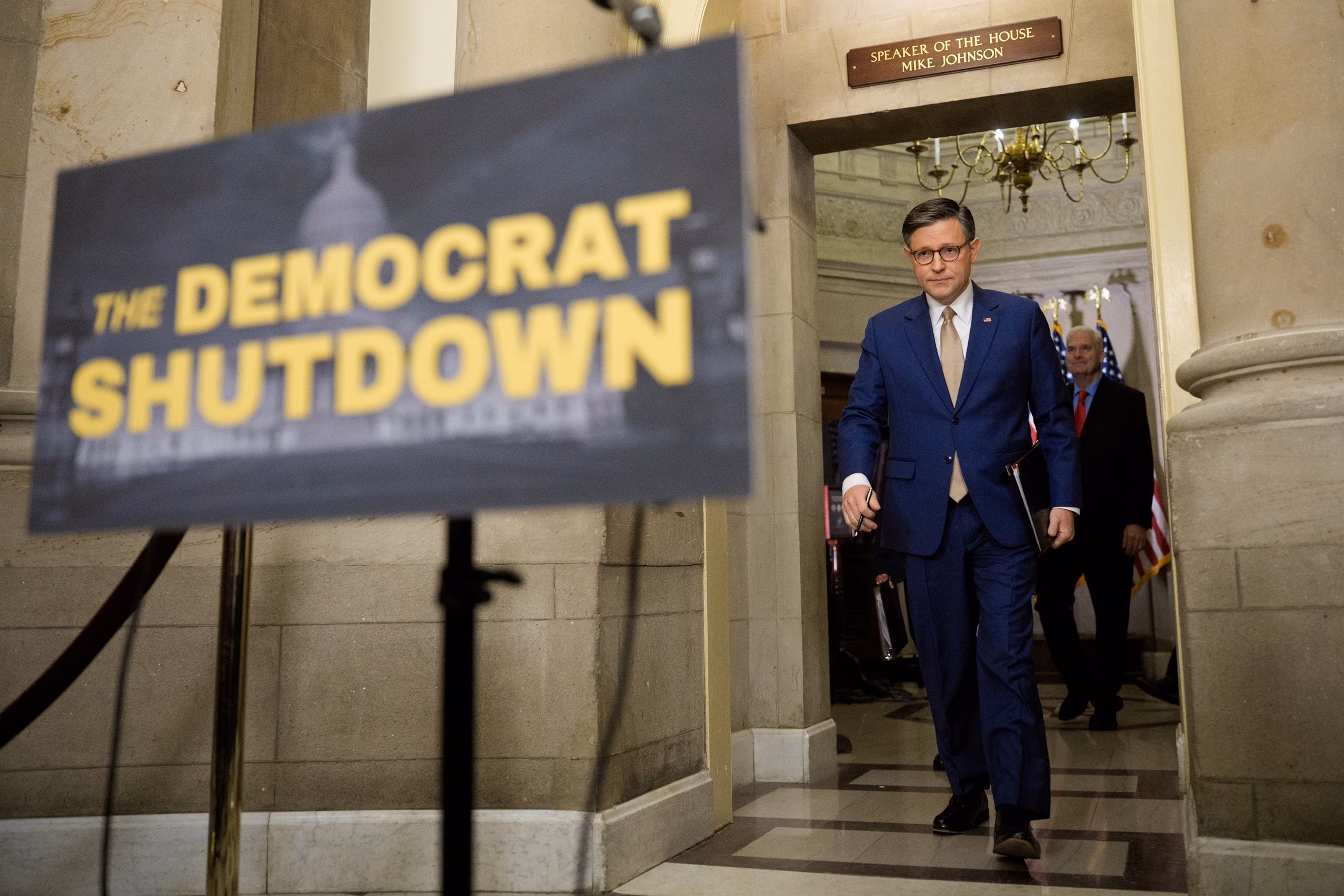 Speaker of the House Mike Johnson, Republican representing Louisiana, speaks during a press conference outside of his office at the US Capitol on the second day of the US government shutdown in Washington, October 2, 2025.Andrew Harnik/Getty Images