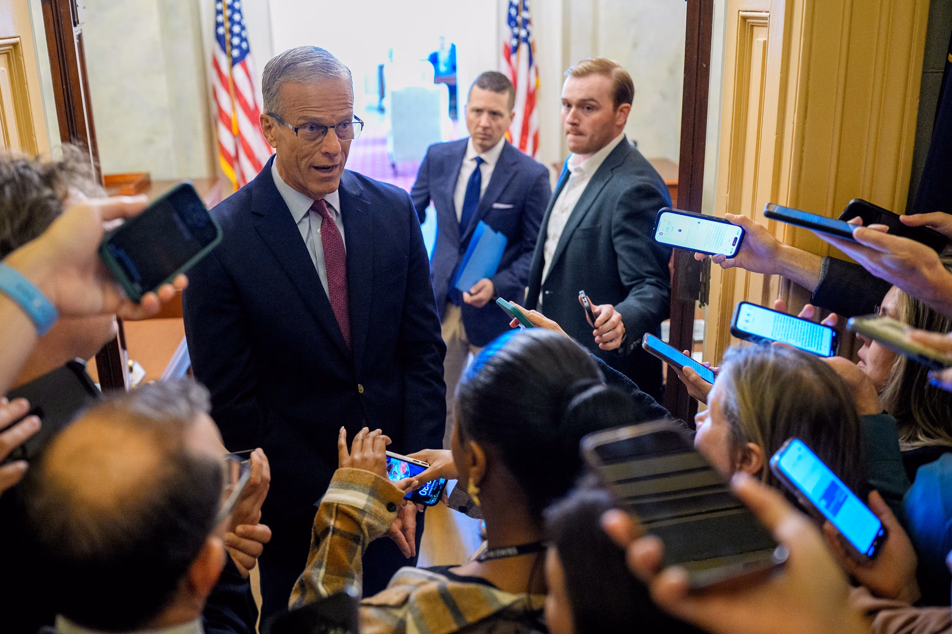 Senate Majority Leader John Thune speaks to reporters outside of his office at the US Capitol, on the second day of the US government shutdown in Washington, October 2, 2025.Andrew Harnik/Getty Images