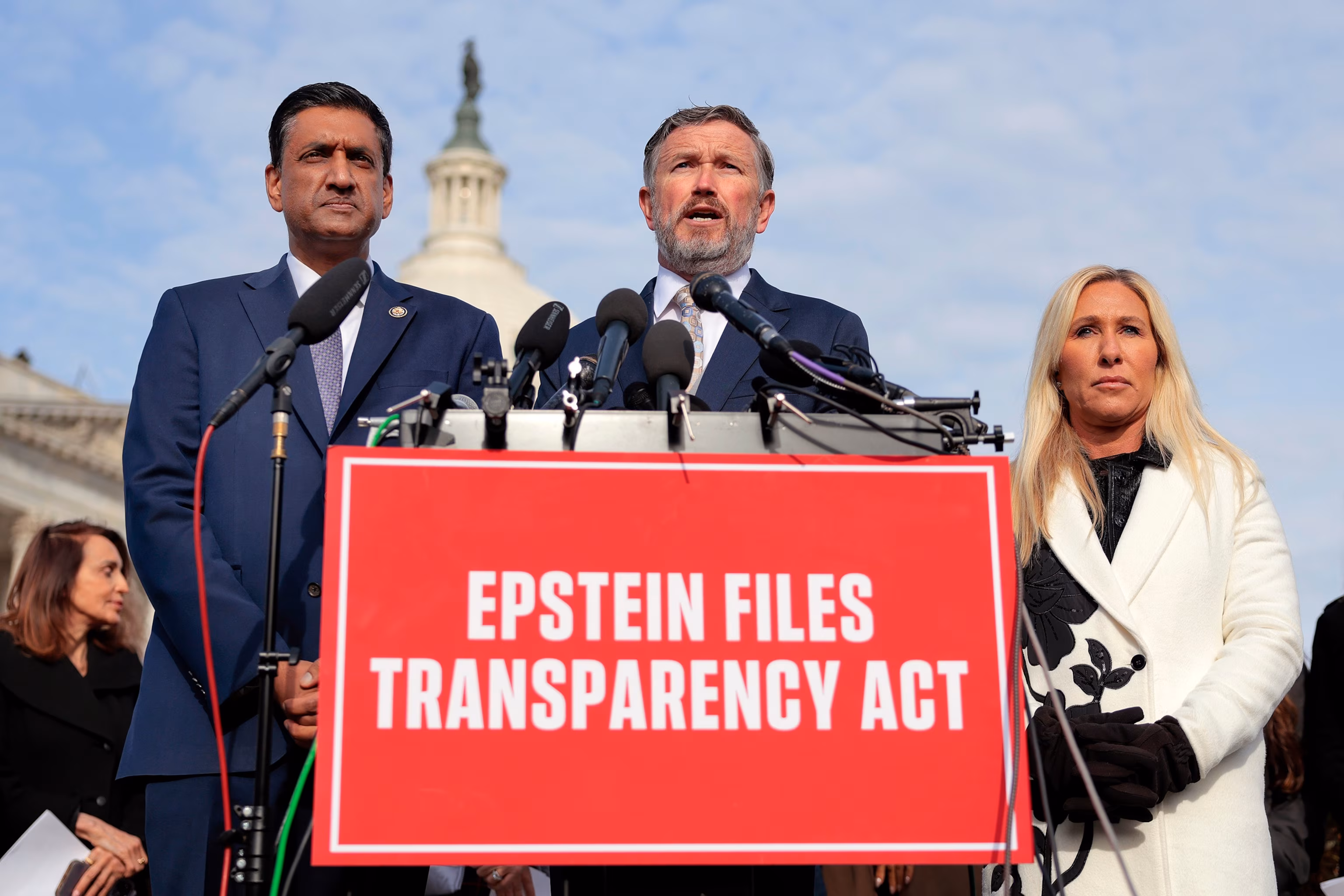 Rep. Thomas Massie speaks alongside Rep. Ro Khanna and Rep. Marjorie Taylor Greene during a news conference on the Epstein Files Transparency Act outside the U.S. Capitol, November 18, 2025 in Washington.Heather Diehl/Getty Images