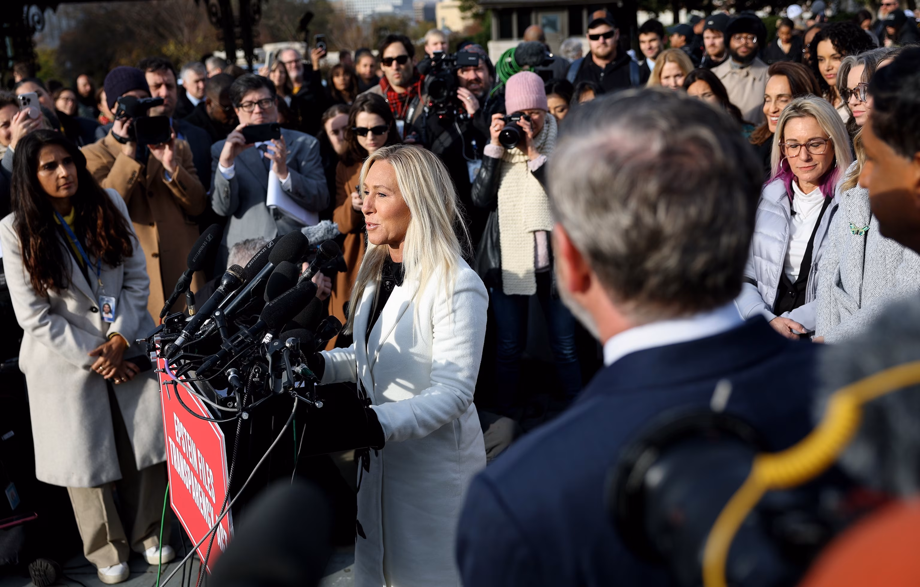 Rep. Marjorie Taylor Greene speaks during a news conference with Rep. Ro Khanna, Rep. Thomas Massie and Jeffrey Epstein abuse survivors on the Epstein Files Transparency Act outside the U.S. Capitol, November 18, 2025 in Washington.Anna Moneymaker/Getty Images