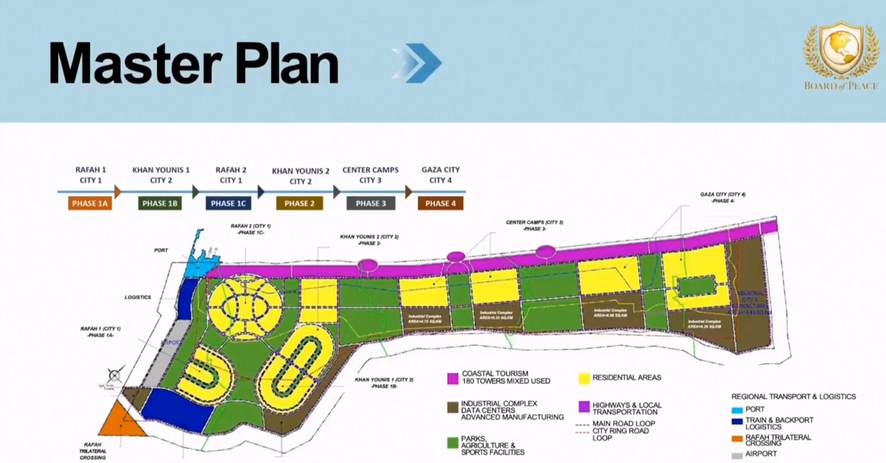 Kushner displayed a "master Plan" that depicts four phases: Rafah, or "city 1"; Khan Younis or "city 2"; Center Camps or "city 3"; and Gaza City or "city 4."