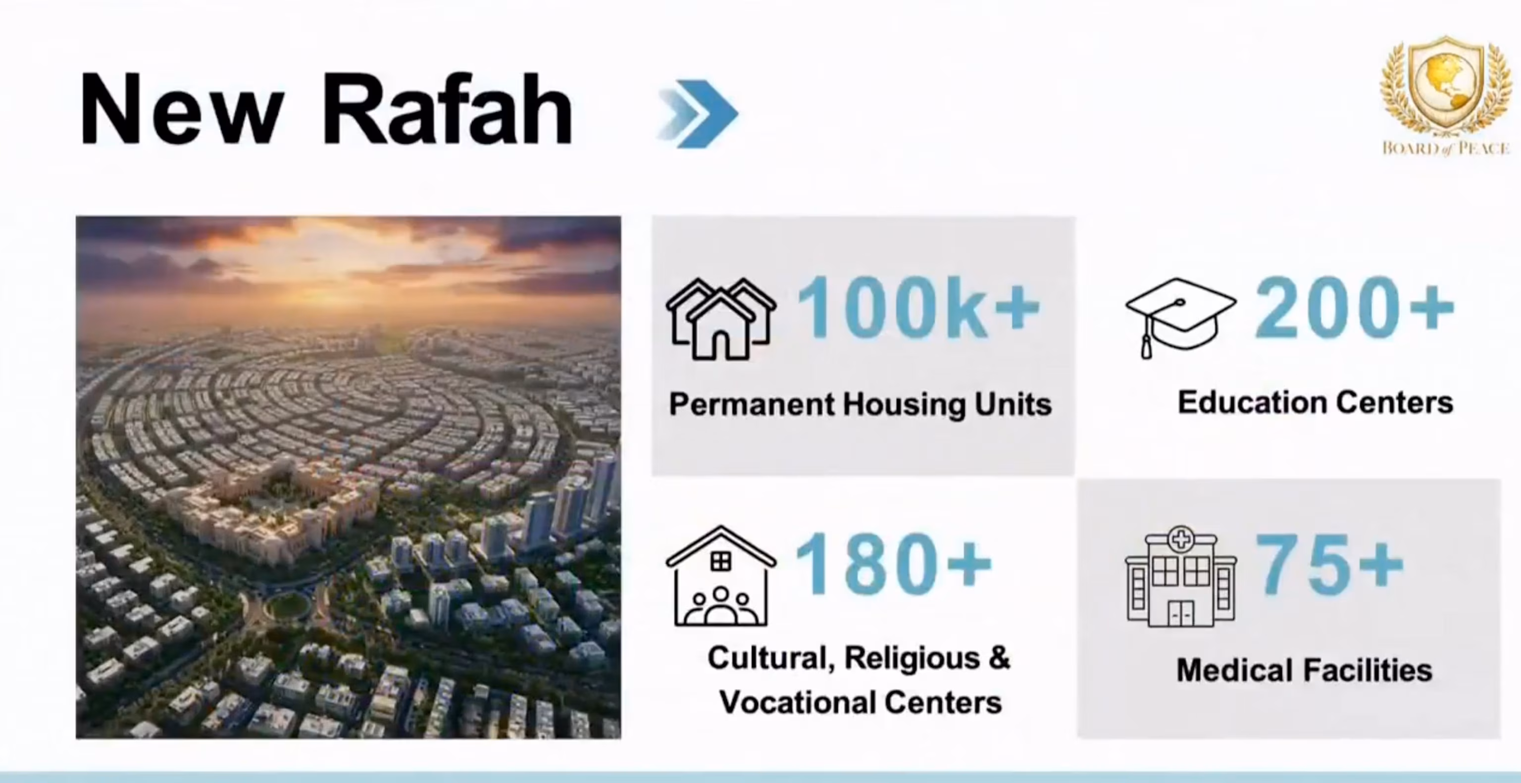 In "New Rafah," Kushner put up a slide that claims there will be over 100,000 permanent housing units, 200 education centers, 180 cultural, religious and vocational centers and 75 medical facilities.