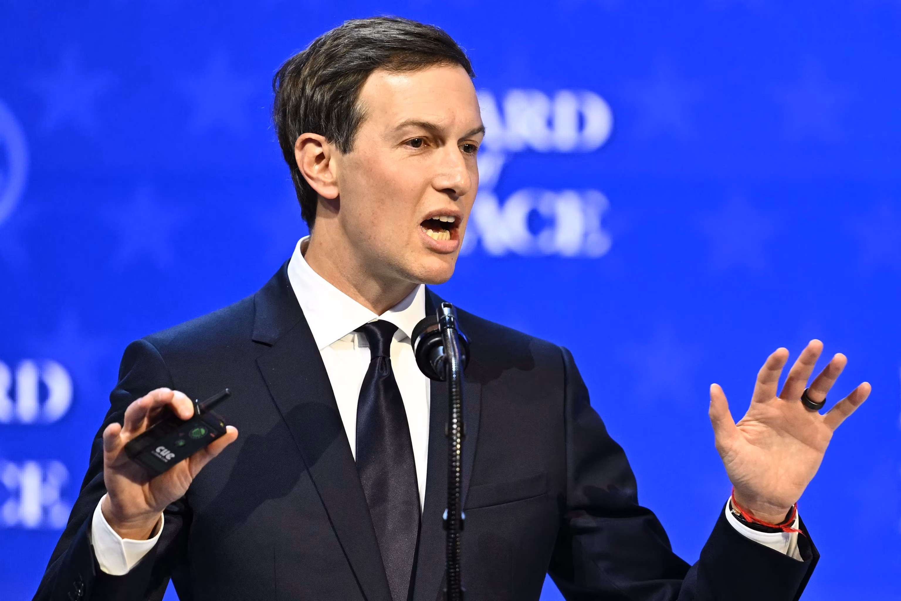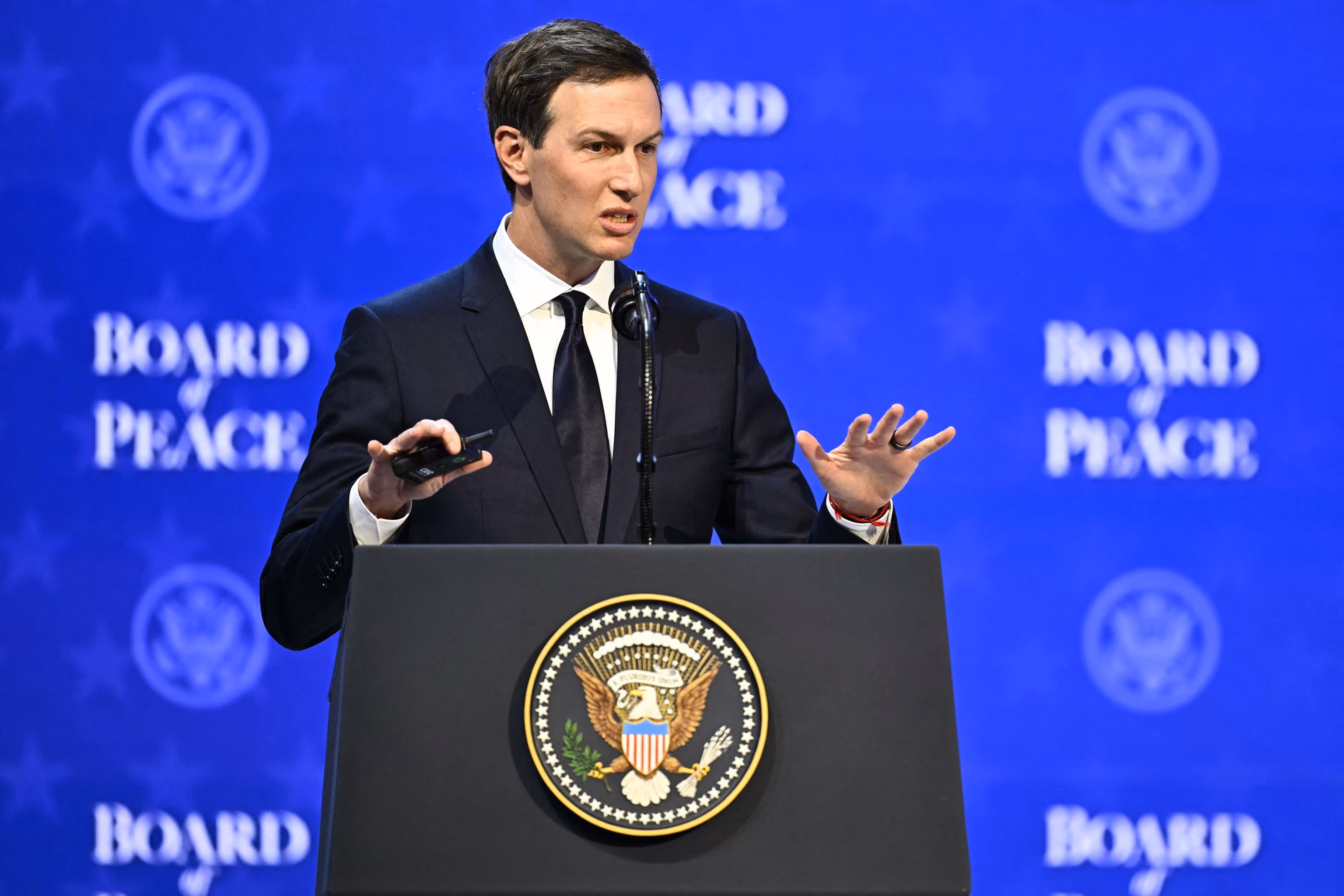 Jared Kushner speaks at the “Board of Peace” meeting during the World Economic Forum Jannual meeting in Davos, January 22, 2026.Fabrice Coffrini/AFP via Getty Images