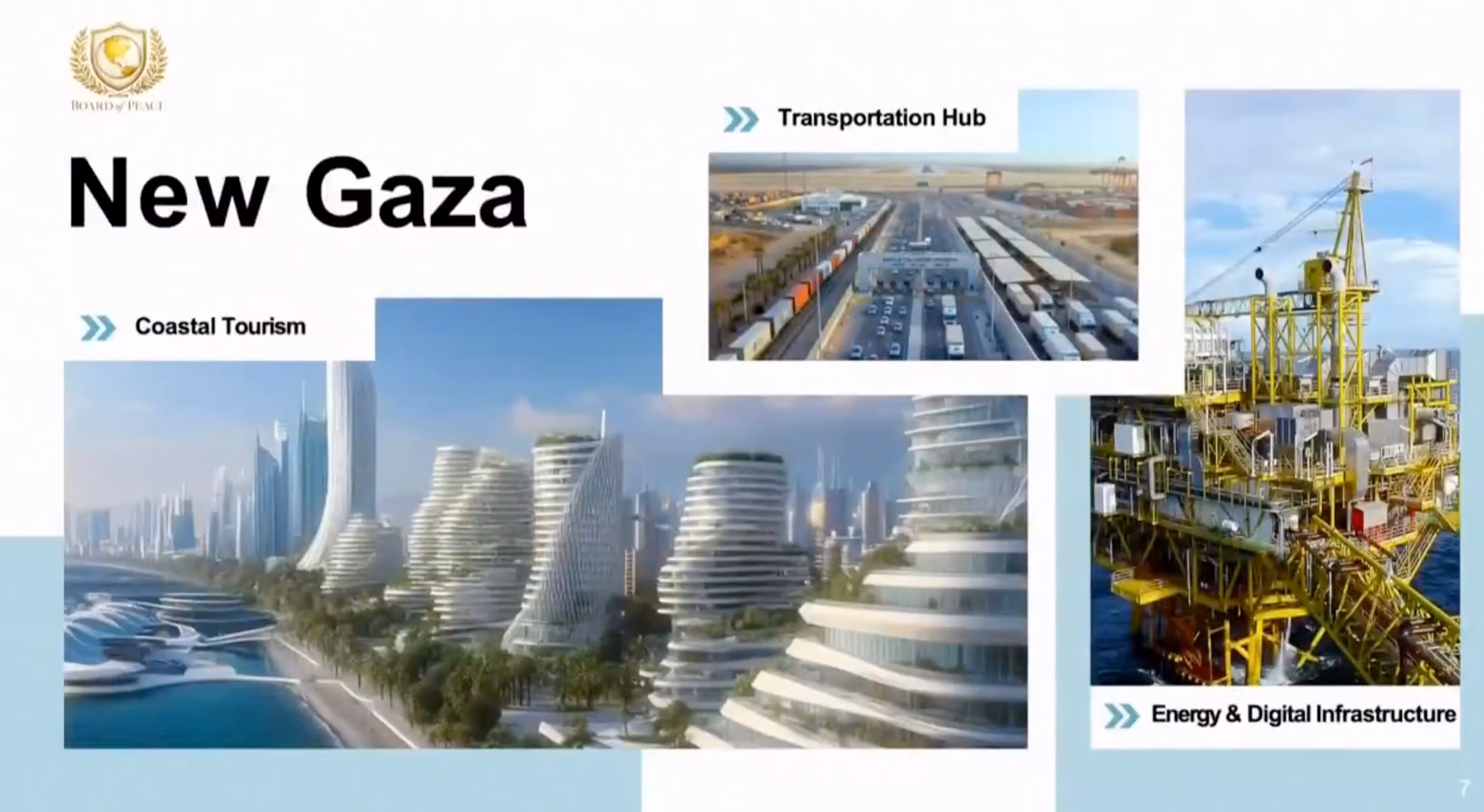 During remarks at the Board of Peace signing ceremony Davos, Switzerland, January 22, 2026, Gaza peace negotiator and real estate investor Jared Kushner unveiled some of the ‘master plan’ with renderings to be built in war-torn Gaza.Gaza Development Plan