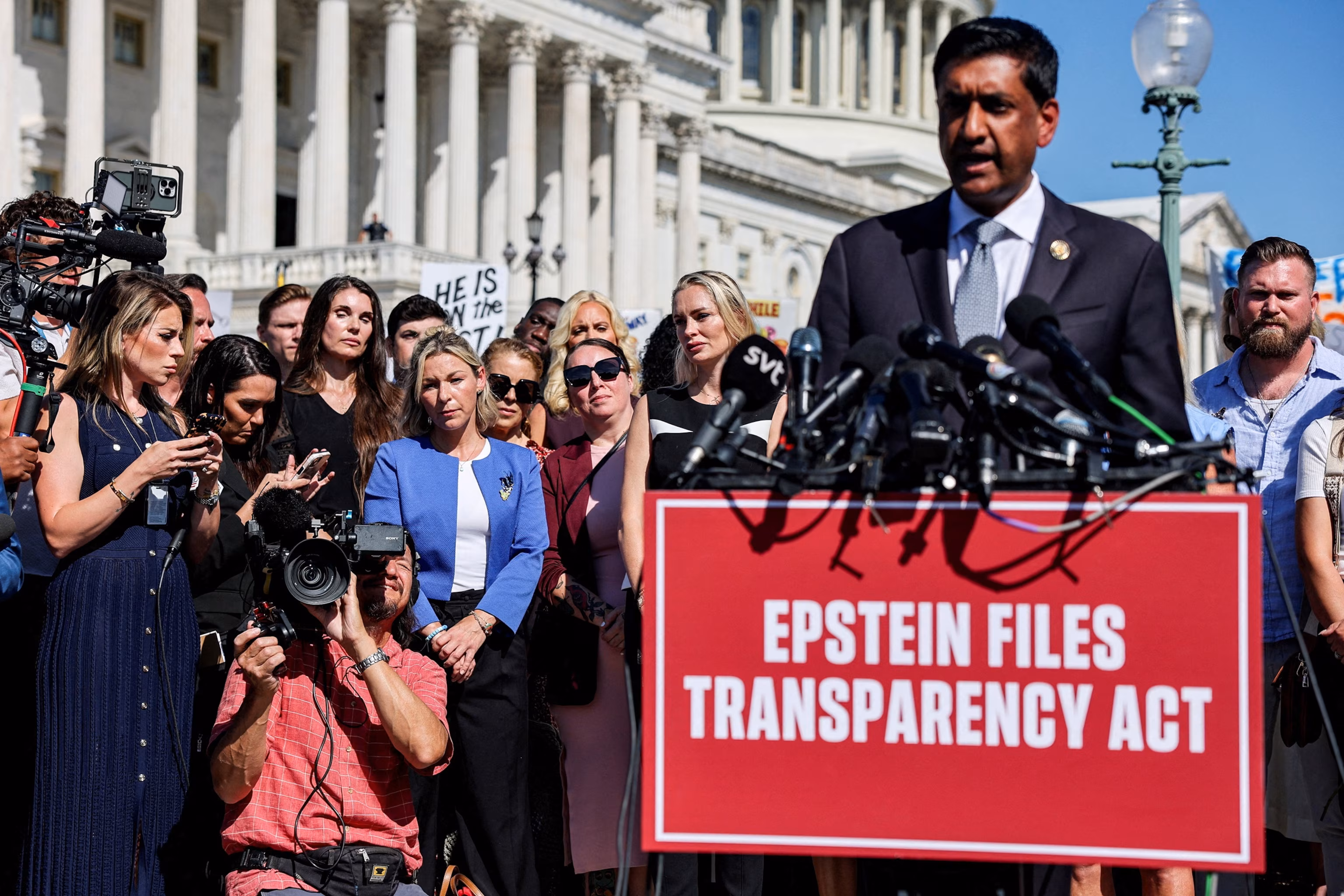 U.S. Representative Ro Khanna (D-CA) stands in front of accusers and survivors as he speaks during a press conference to discuss the Epstein Files Transparency bill, directing the release of the remaining files related to the investigations into Jeffrey Epstein and Ghislaine Maxwell, on Capitol Hill in Washington, D.C., U.S., September 3, 2025.Jonathan Ernst/Reuters