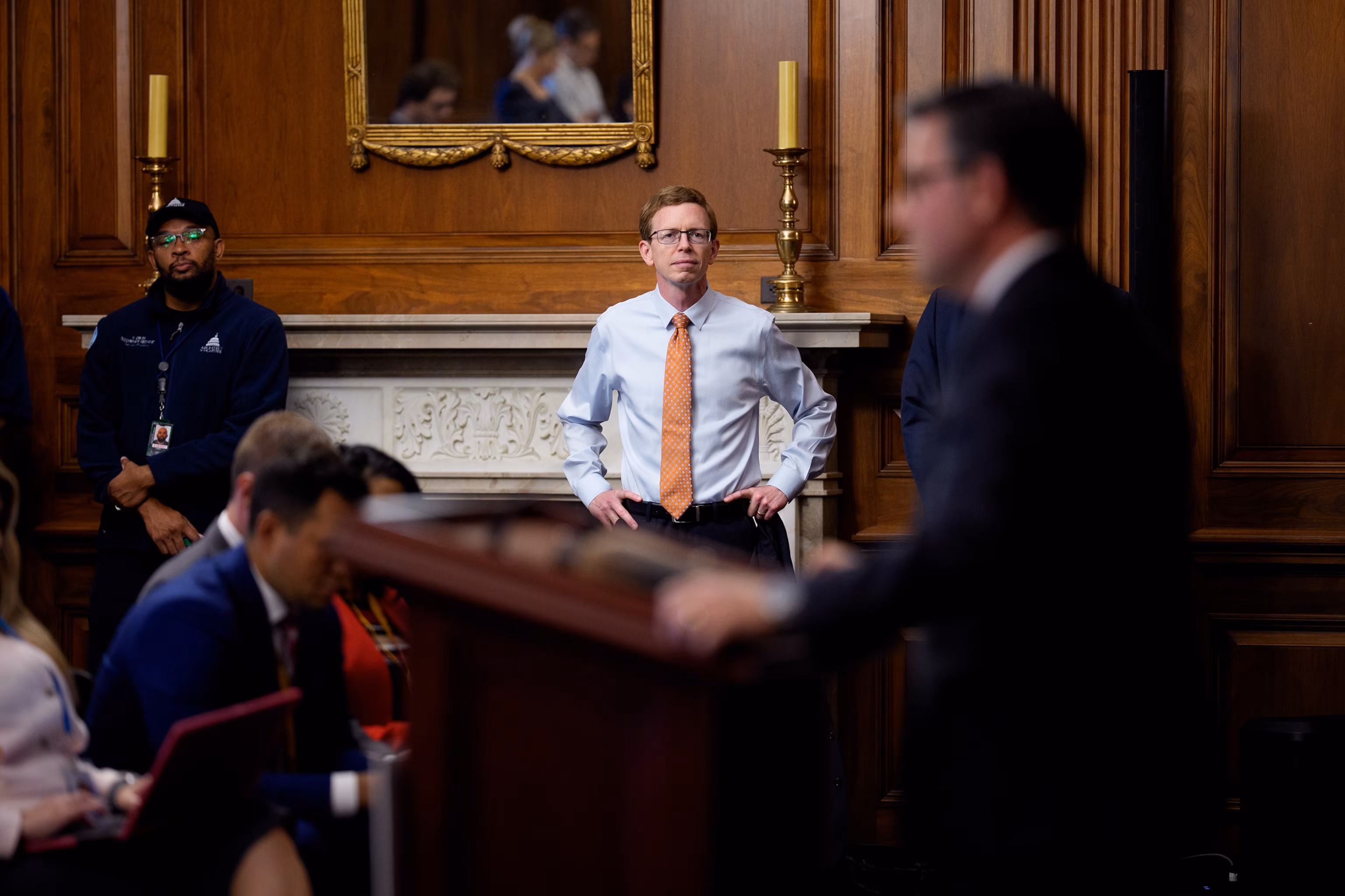 Rep. Dusty Johnson listens as Speaker of the House Mike Johnson speaks during a news conference on Capitol Hill, Oct. 7, 2025.Andrew Harnik/Getty Images