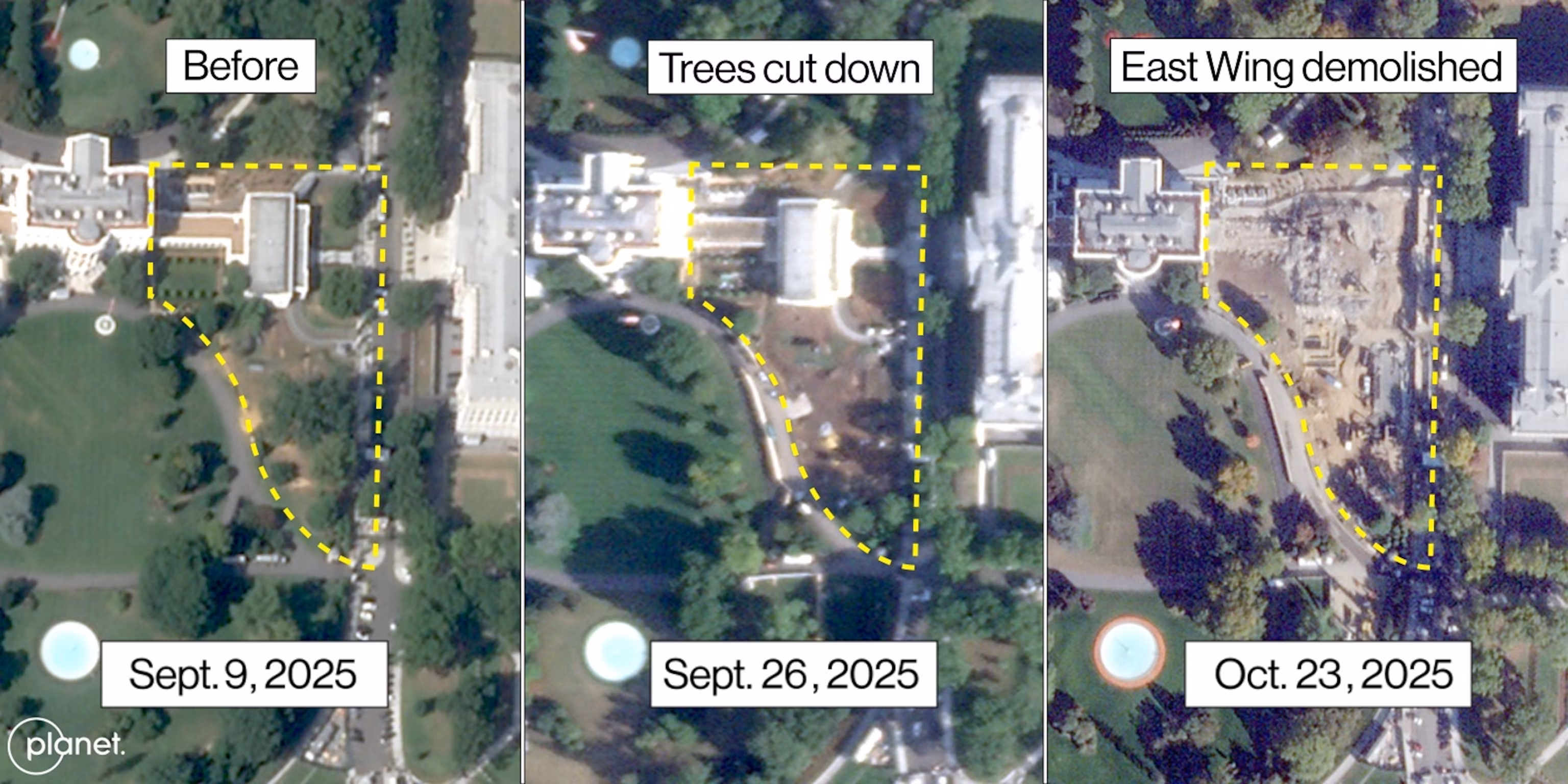 Satellite depictions of the White House acquired by Planet Labs on Thursday indicate that the East Wing has been dismantled, while ground preparation seems to have begun on neighboring land that the ballroom is slated to occupy.