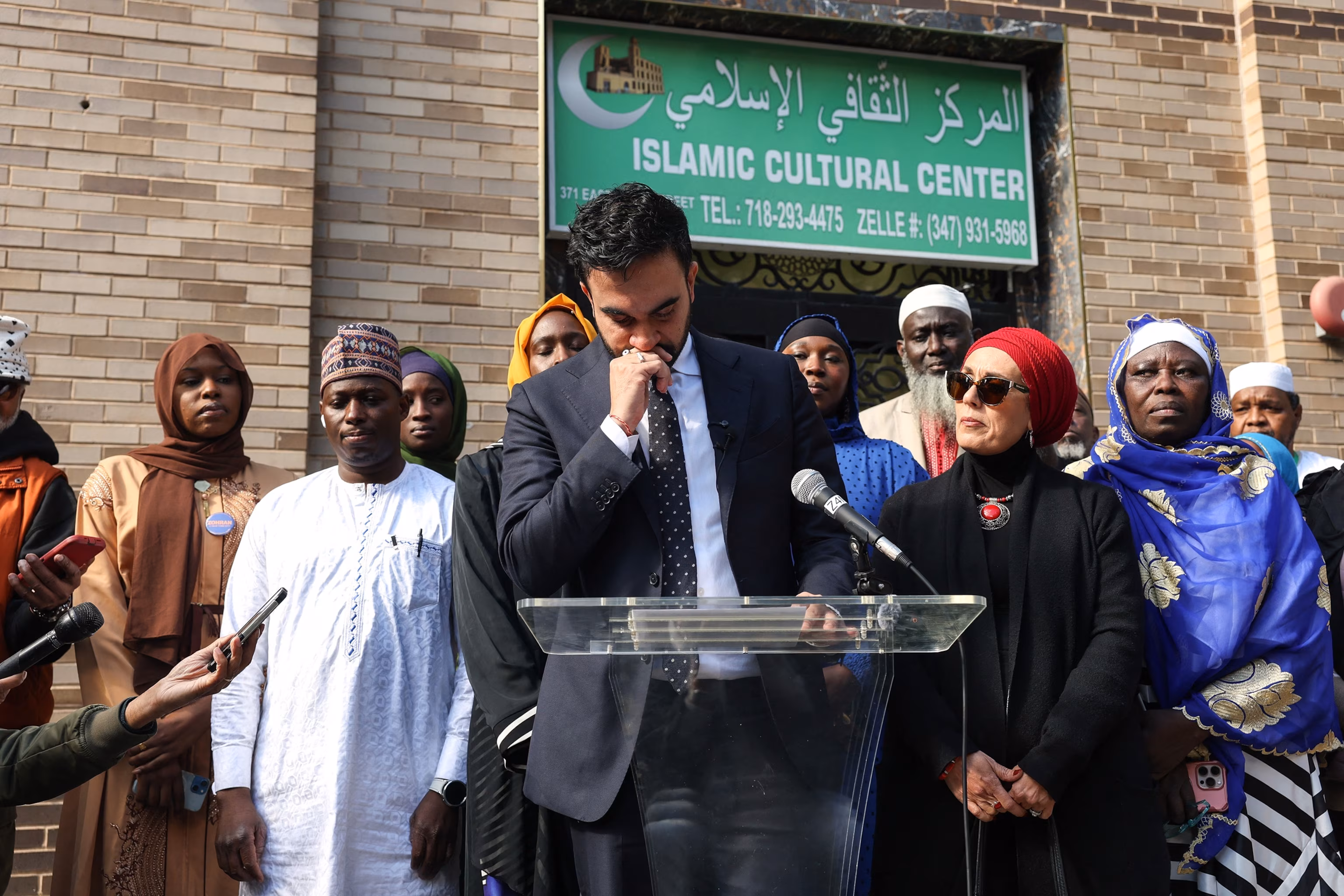 New York City mayoral hopeful Zohran Mamdani pauses as he discusses Islamophobia outside the Islamic Cultural Center of the Bronx in New York on Oct. 24, 2025.Timothy A.clary/AFP via Getty Images