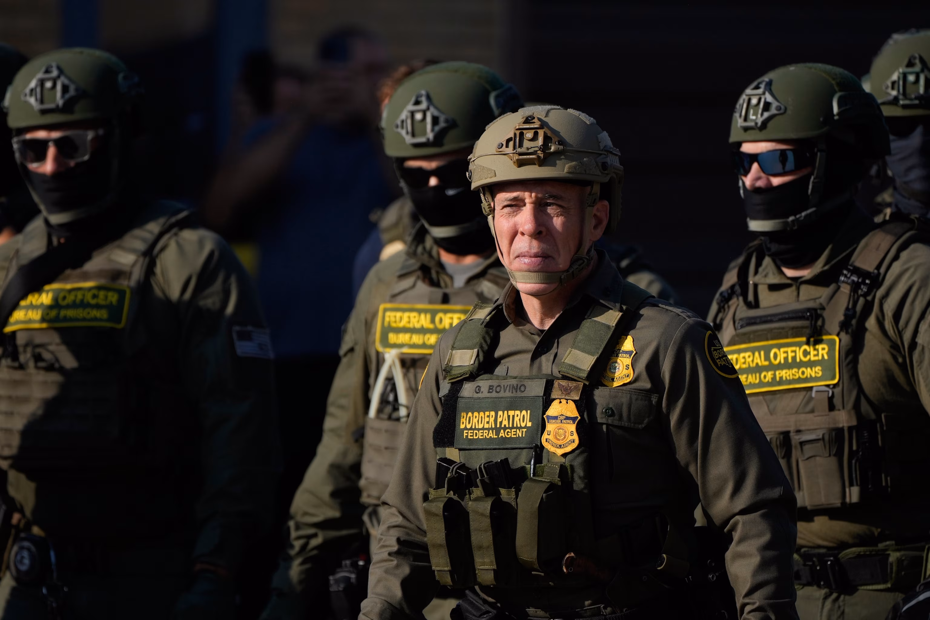 Greg Bovino, the lead patrol official for the U.S. Border Patrol El Centro jurisdiction, center, is pictured with federal immigration officials in the vicinity of an Immigration and Customs Enforcement building in Broadview, Ill., Oct. 3, 2025.Erin Hooley/AP