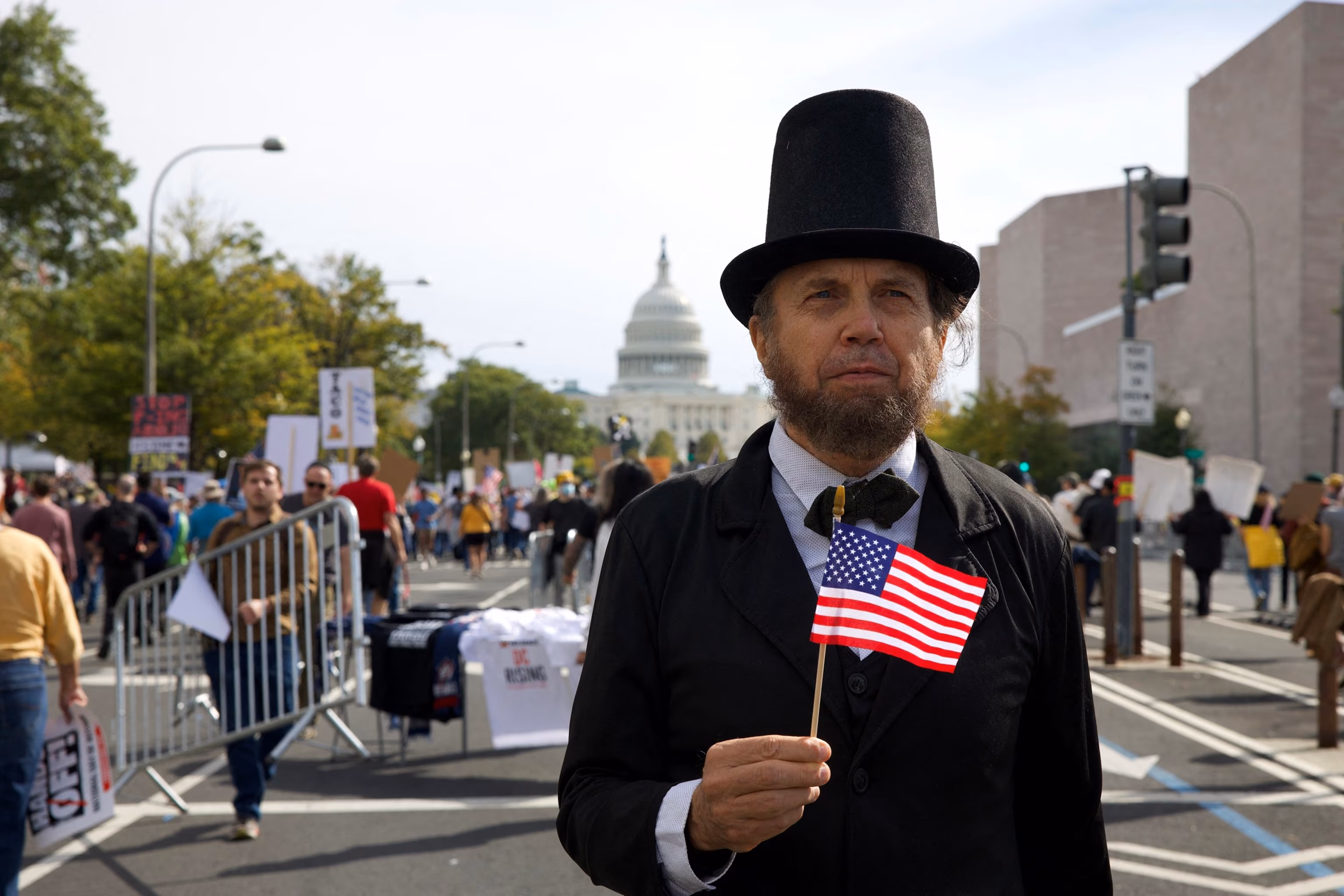 A man dressed as former President Abraham Lincoln holding an American flag participates in a “No Kings” national day of protest in Washington, D.C.,, on Oct. 18, 2025.Amid Farahi/AFP via Getty Images