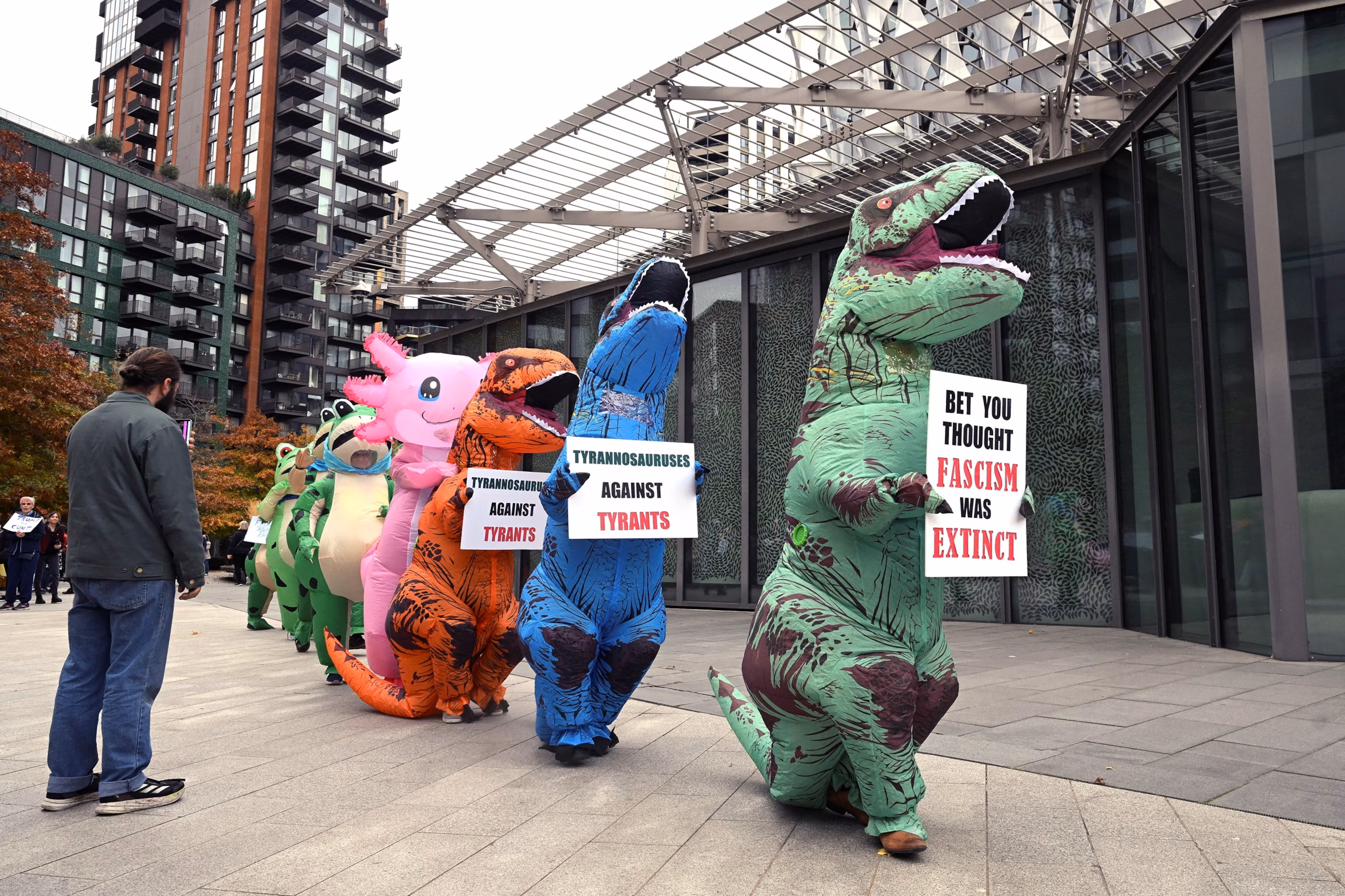 Demonstrators wearing costumes walk during a ‘No Kings’ protest, part of a global campaign against U.S. President Donald Trump’s policies, outside the U.S. Embassy in London, Oct. 18, 2025.Jaimi Joy/Reuters