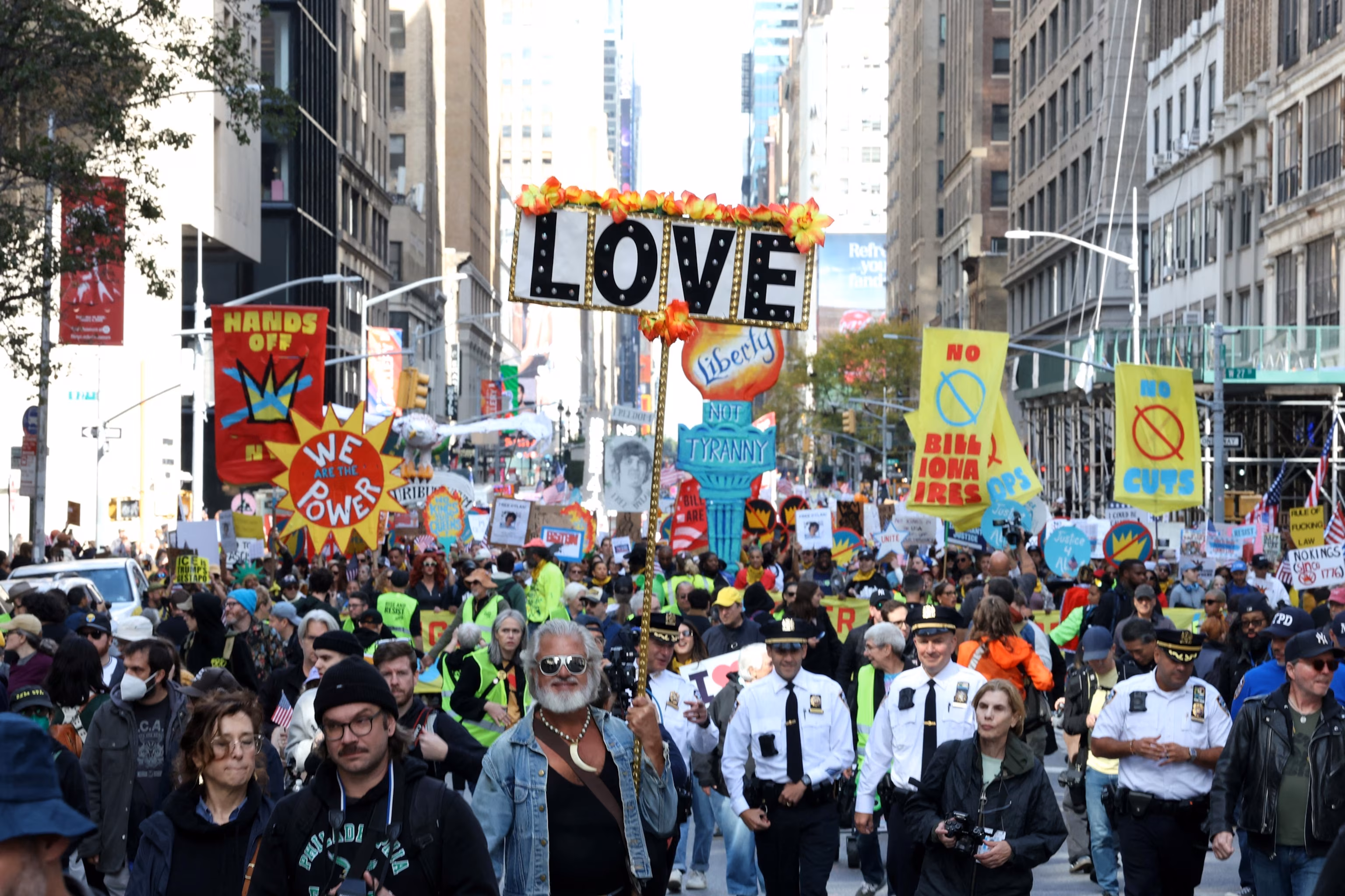People participate in a “No Kings” national day of protest in New York, on Oct. 18, 2025.Timothy A.c Clary/AFP via Getty Images