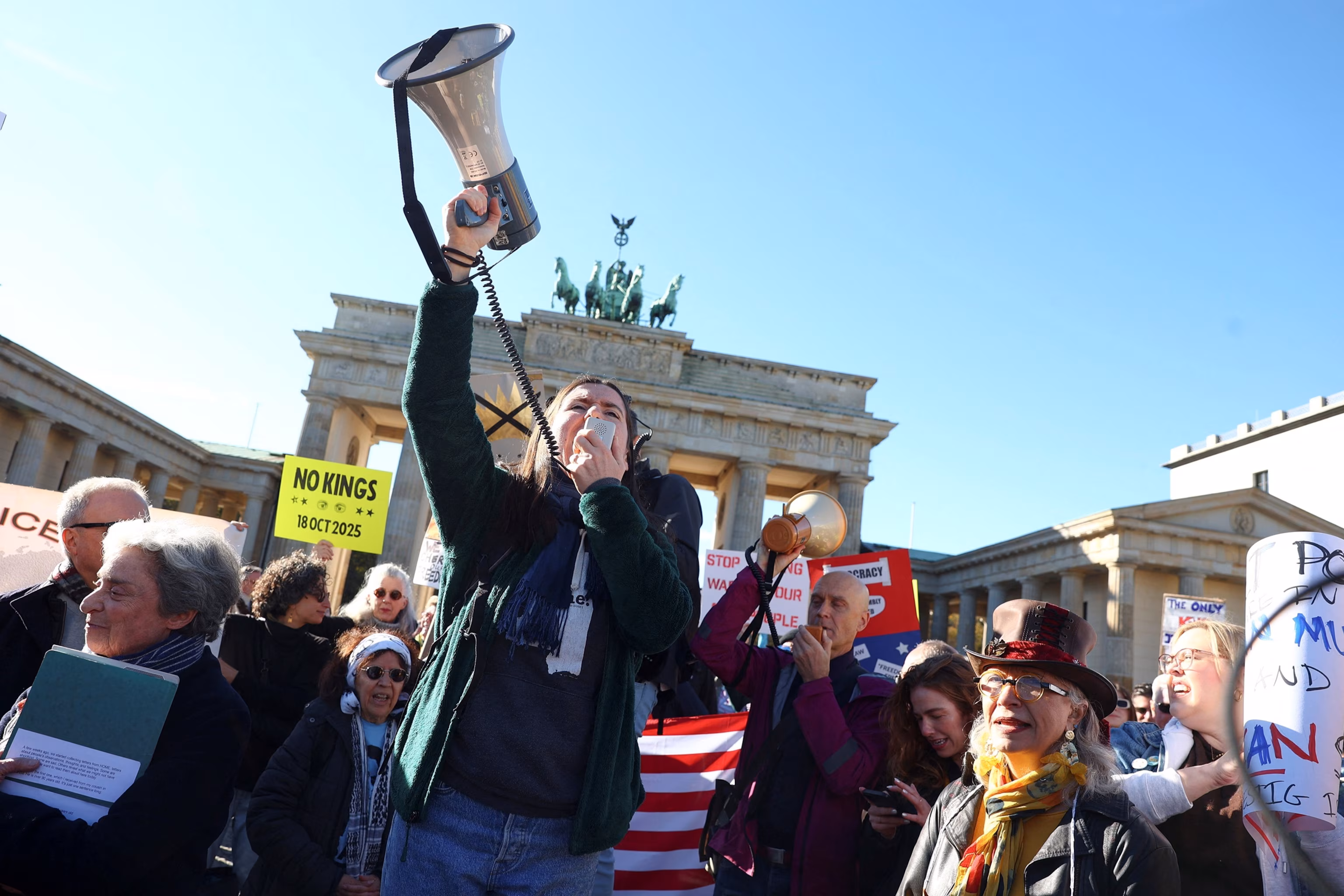 A demonstrator uses a megaphone during a “No Kings” rally against U.S. President Donald Trump and his administration, near the U.S. embassy in Berlin, Oct. 18, 2025.Christian Mang/Reuters