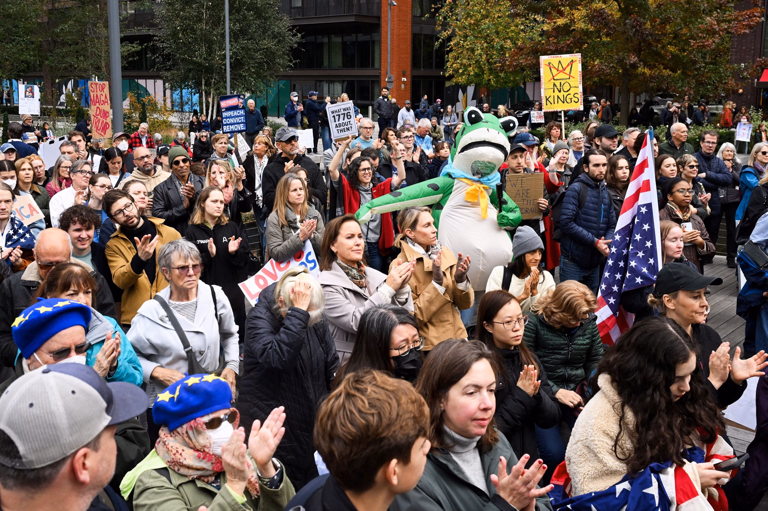 Demonstrators hold flags and placards during a “No Kings” protest against President Donald Trump’s policies, in Washington, D.C., Oct. 18, 2025.Leah Millis/Reuters