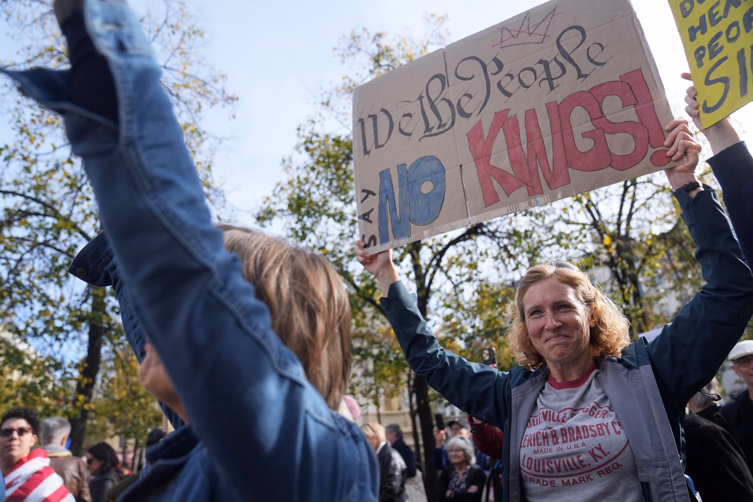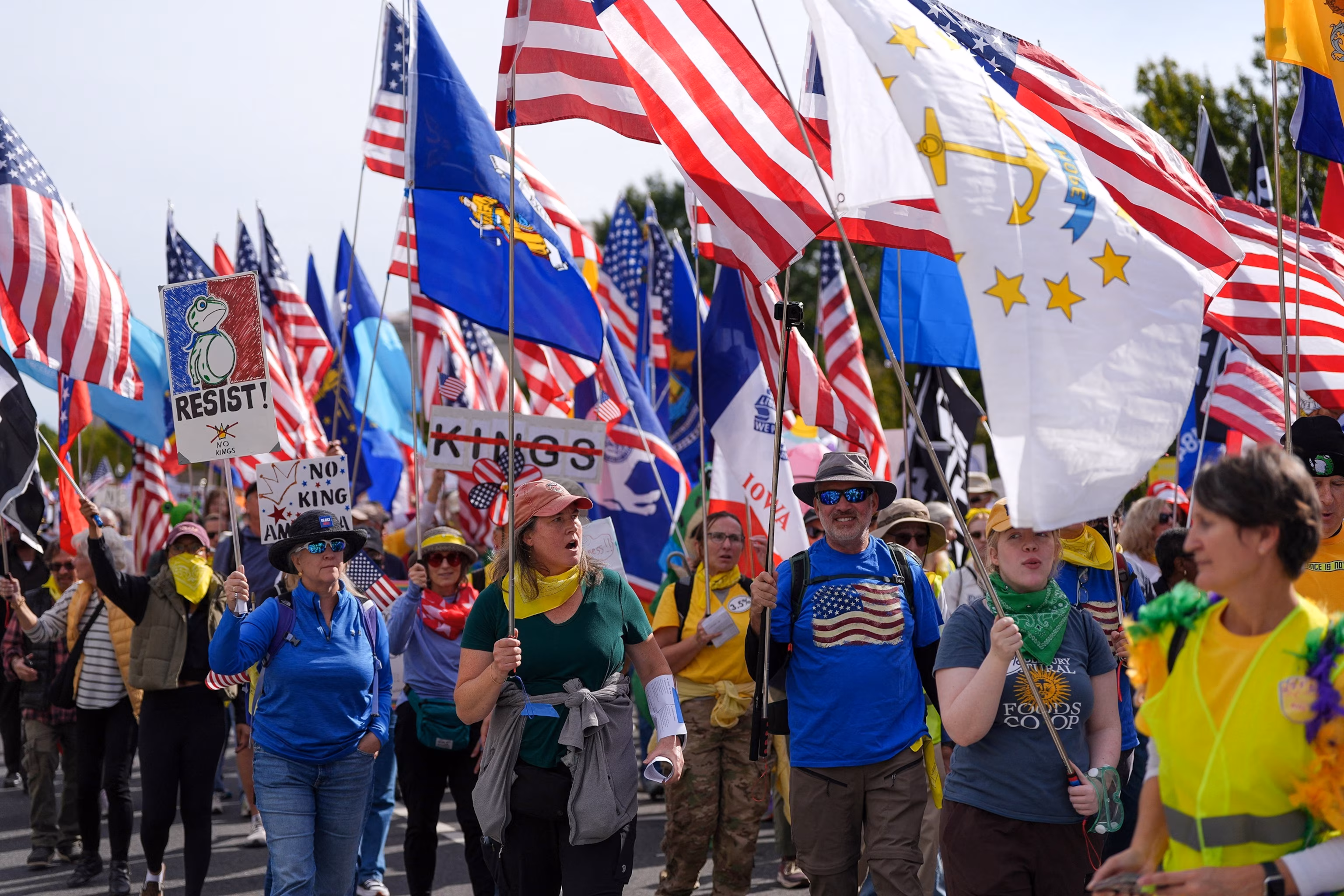 2:03Protesters brandish flags and signs during a “No Kings” demonstration opposing President Donald Trump’s actions, in Washington, D.C., Oct. 18, 2025. Leah Millis/Reuters