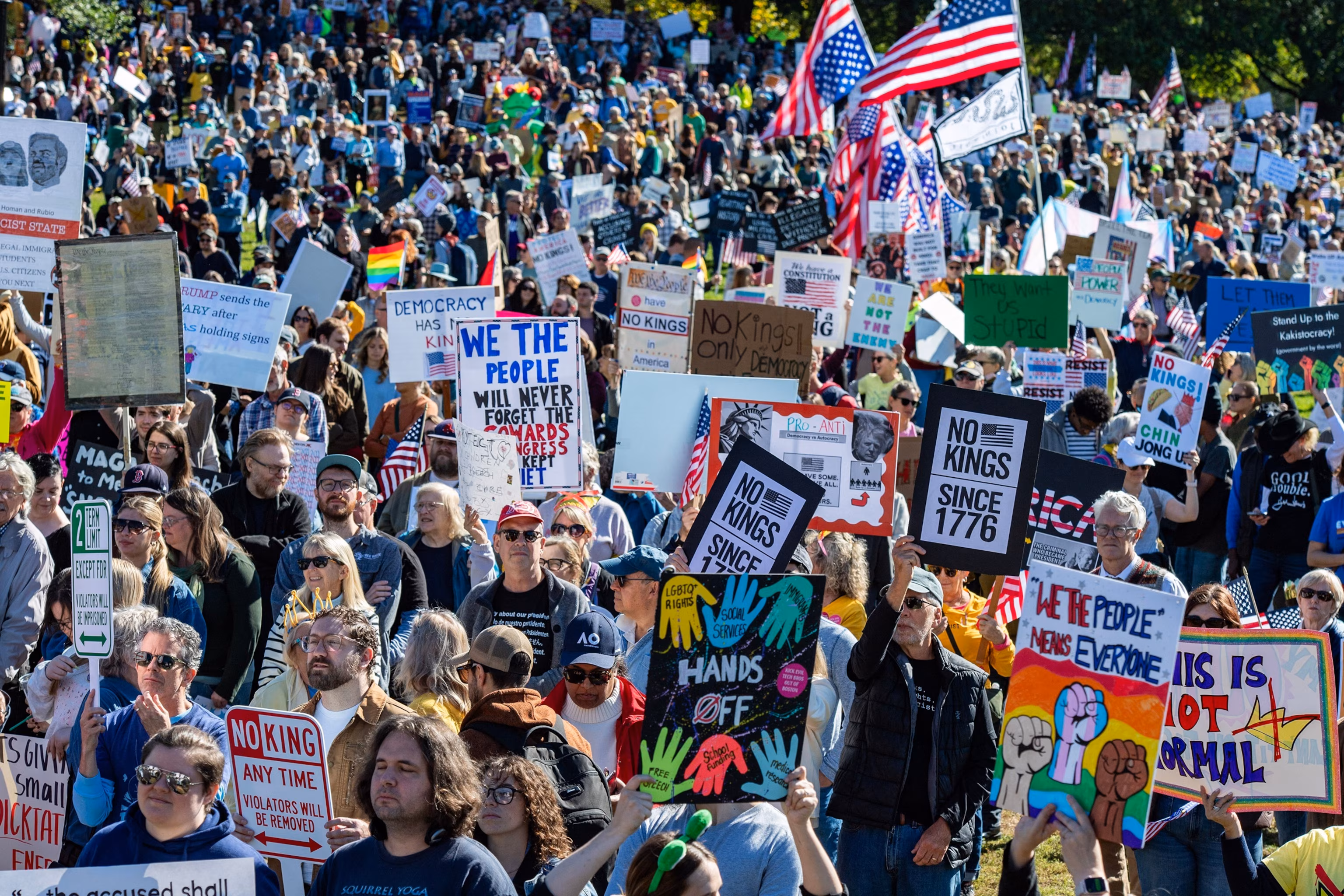 People participate in a “No Kings” national day of protest in Boston, Massachusetts, on Oct. 18, 2025.Joseph Prezioso/AFP via Getty Images