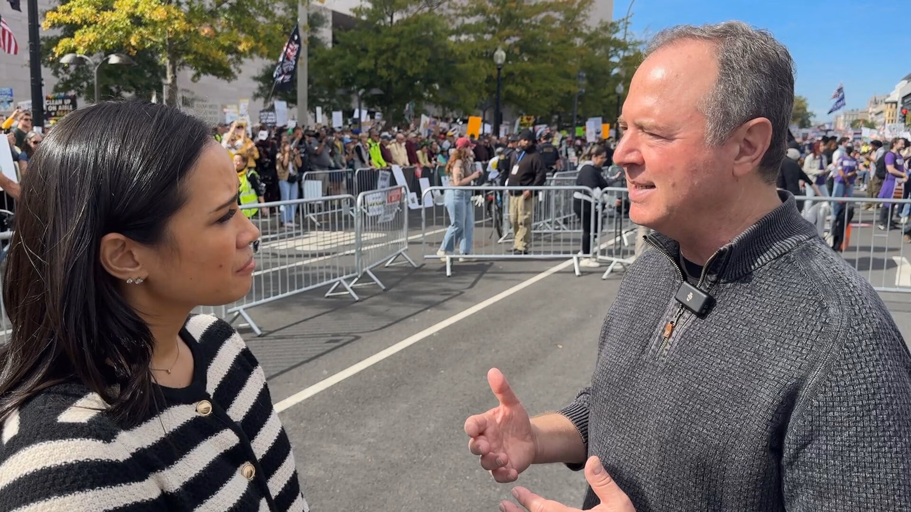 ABC News’ Christiane Cordero interviews Sen. Adam Schiff at the No Kings rally in Washington, D.C., on Oct. 18, 2025.ABC News