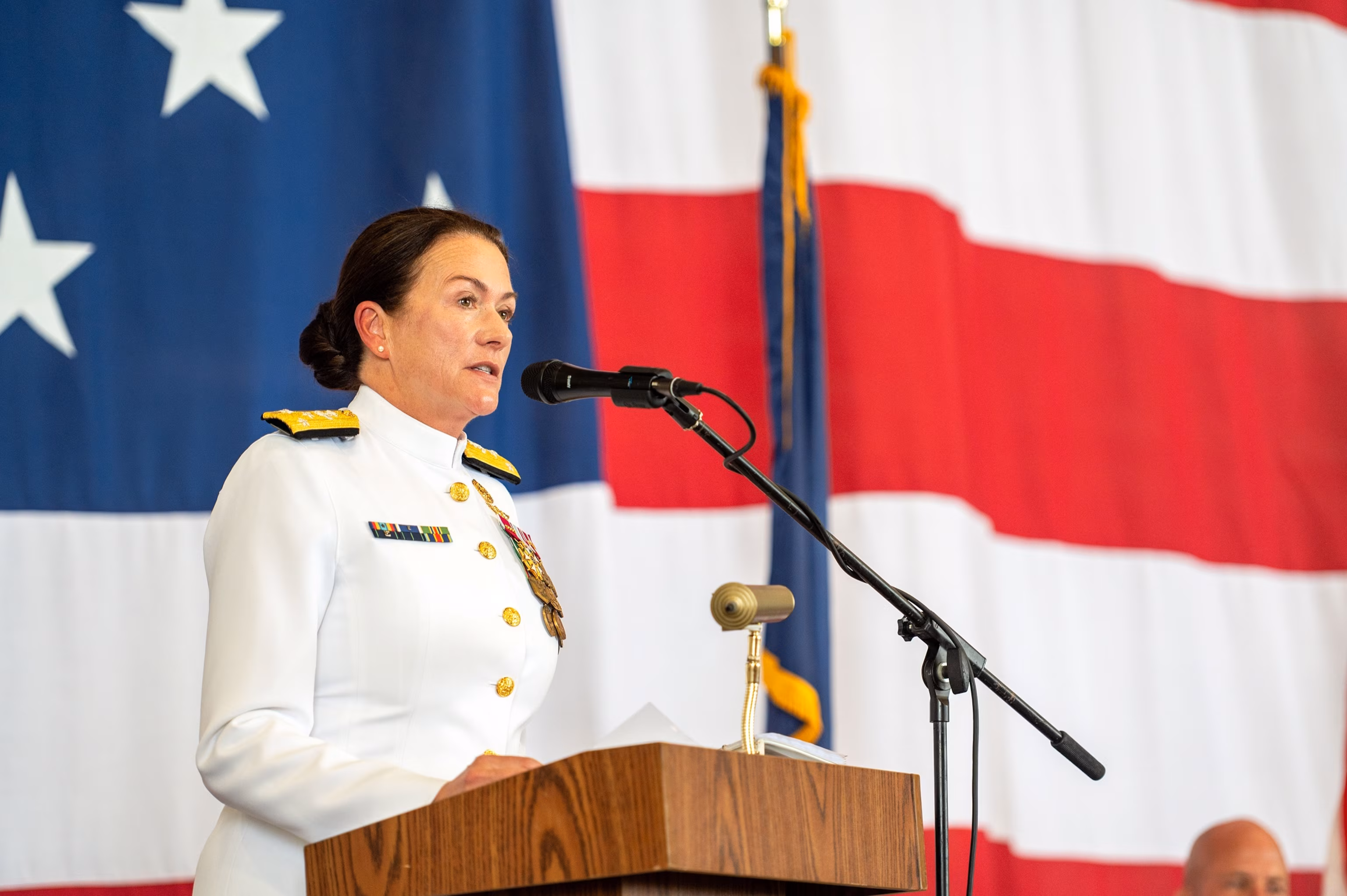 Vice Adm. Nancy Lacore, Chief of Navy Reserve, officiates a change of command ceremony at Naval Station Norfolk on June 27, 2025. U.S. Navy photo by Mass Communication Specialist 1st Class Tyra M. Watson