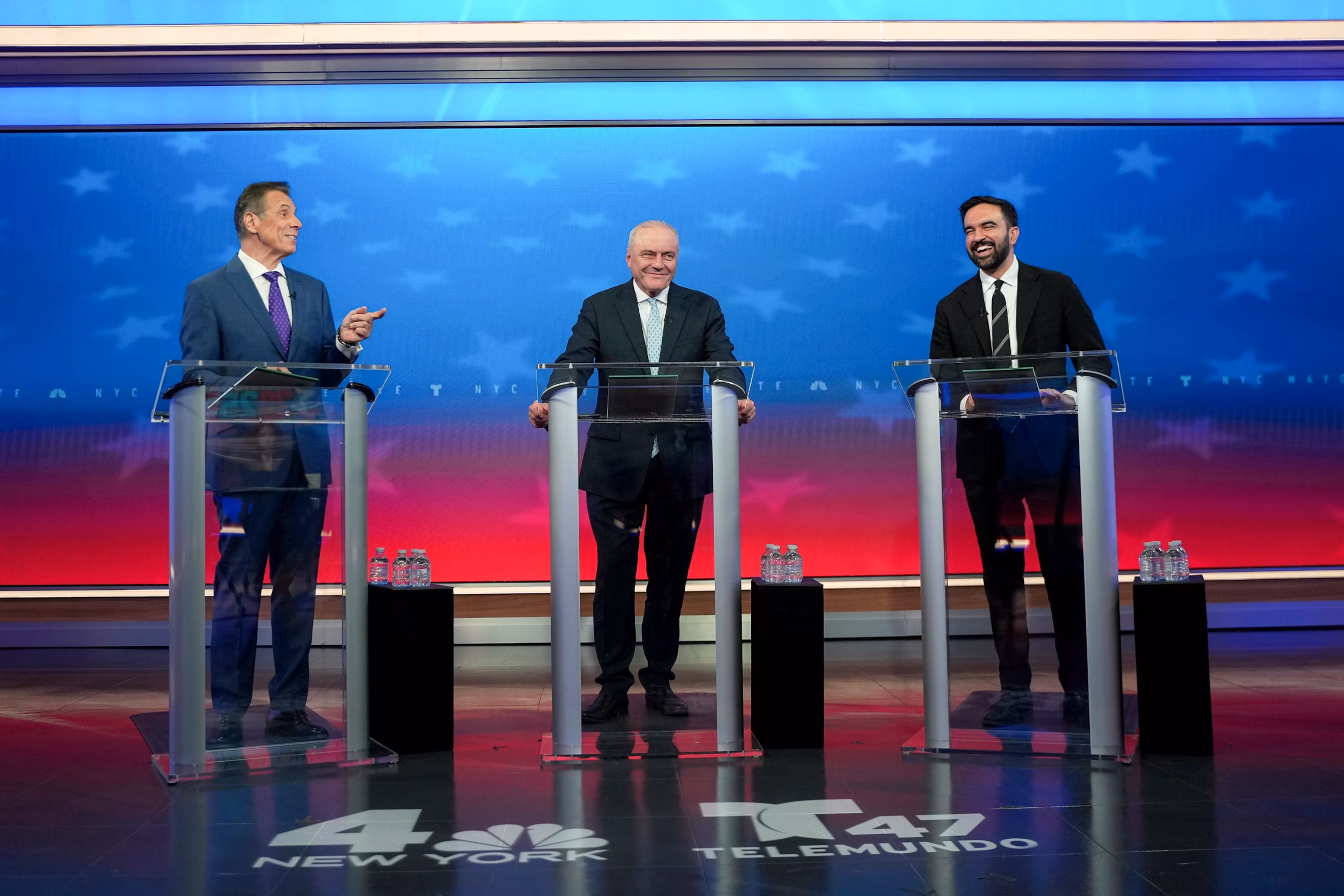Mayoral candidates, Independent nominee former New York Gov. Andrew Cuomo, Republican nominee Curtis Sliwa and Democratic nominee Zohran Mamdani participate in a mayoral debate at Rockefeller Center on October 16, 2025 in New York City. The candidates for New York City mayor are facing off in their first debate ahead of the November 4 election.Pool/Getty Images