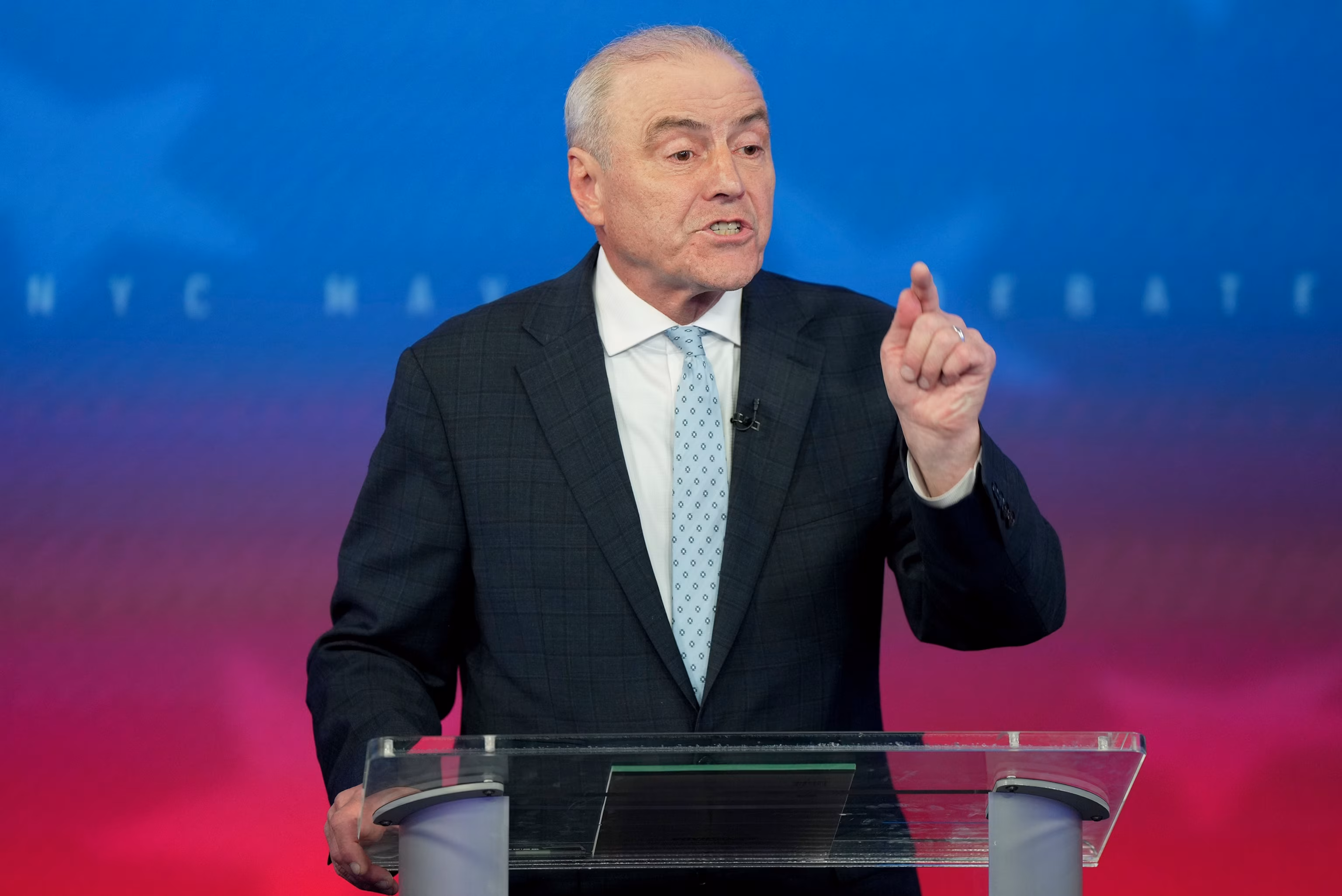NEW YORK, NY – OCTOBER 16: Republican mayoral nominee Curtis Sliwa speaks during a mayoral debate at Rockefeller Center on October 16, 2025 in New York City. The candidates for New York City mayor are facing off in their first debate ahead of the November 4 election.Pool/Getty Images