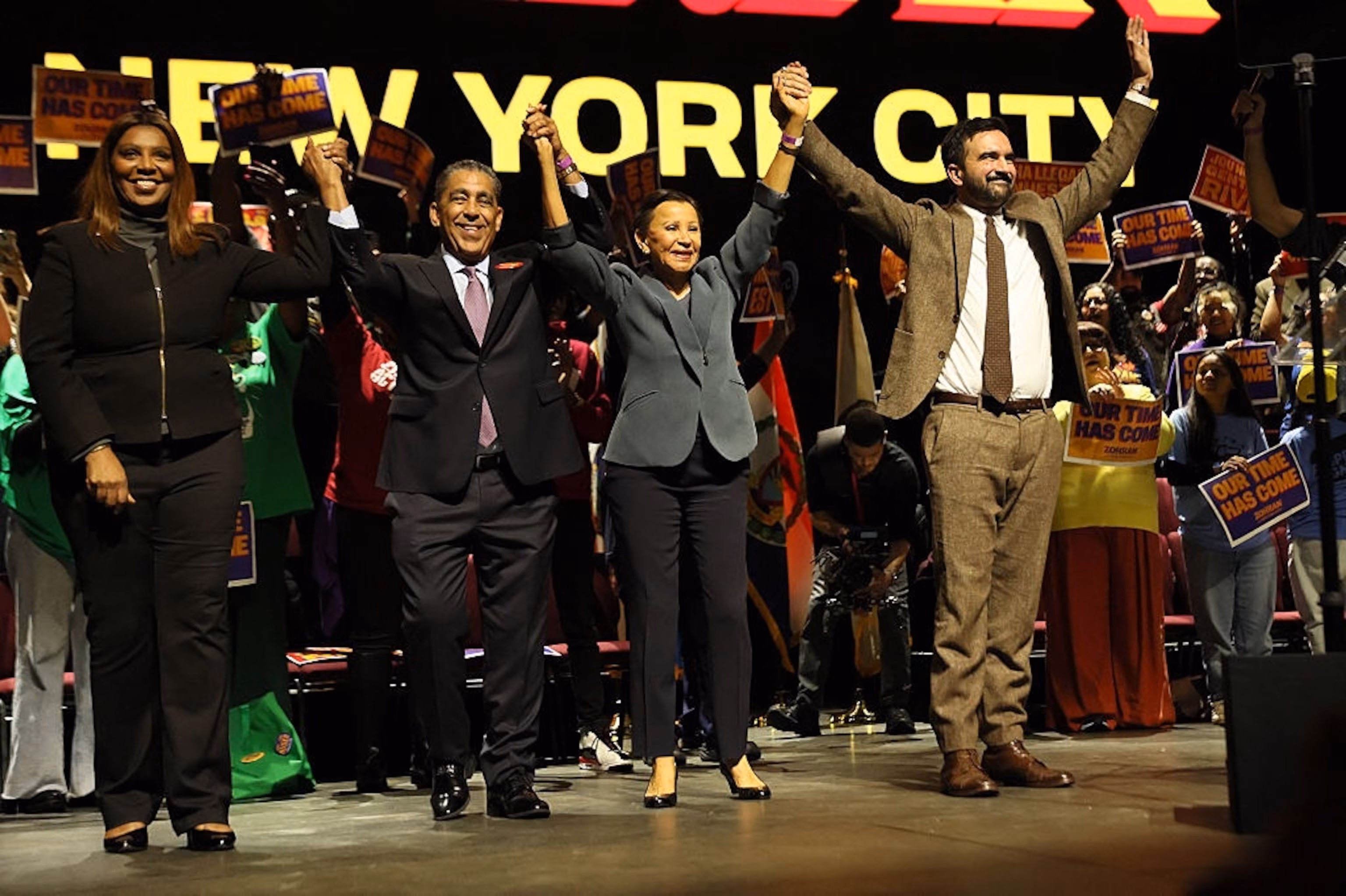 Attorney General Letitia James, Rep. Adriano Espaillat (D-NY), Rep. Nydia Velazquez (D-NY), raise their hands with New York City Mayoral candidate Zohran Mamdani during a campaign rally at United Palace on October 13, 2025 in New York City.Michael M. Santiago/Getty Images