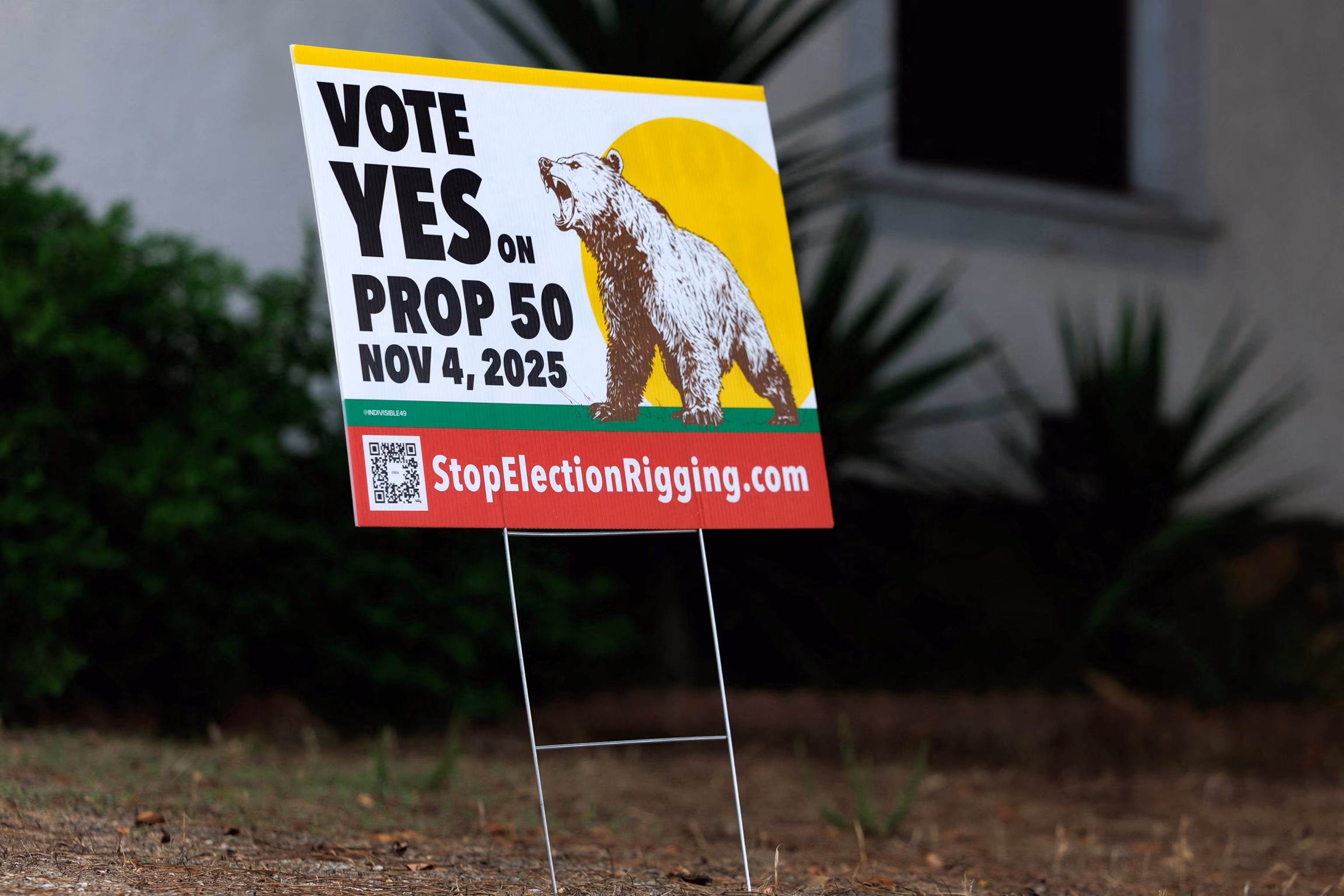 1:07A poster backing Proposition 50, designed to counteract Republican-led map alterations in Texas by reshaping California’s electoral districts to benefit Democrats, is displayed in a suburban area of Encinitas, Calif., Sept. 29, 2025.Mike Blake/Reuters, FILE