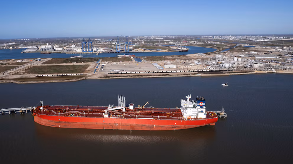 An aerial photo shows the Nave Photon crude oil tanker, carrying a shipment of Venezuelan oil, docked in Freeport, Texas, on Jan. 16, 2026.Mark Felix/AFP via Getty Images