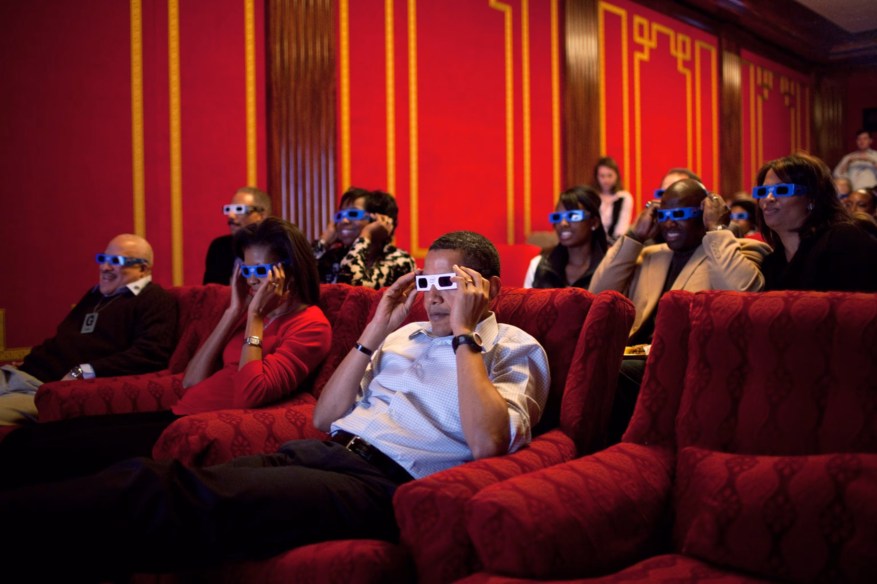 In this Feb. 2, 2008, handout from the White House, President Barack Obama and First Lady Michelle Obama wear 3-D glasses while watching the Super Bowl during a Super Bowl party in the family theater of the White House in Washington, D.C.Pete Souza/White House via Getty Images, FILE