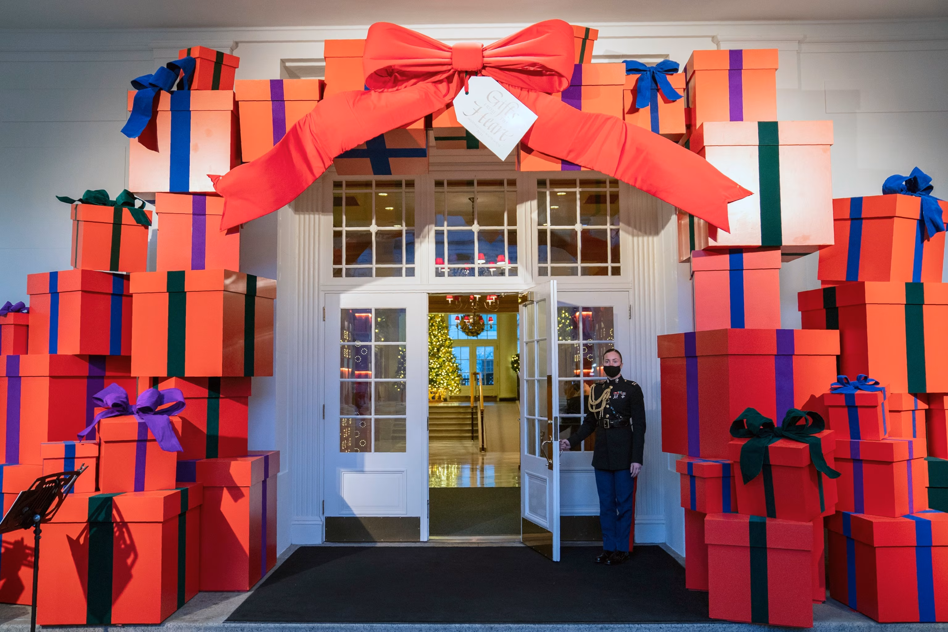 A Marine White House military social aide holds the door to the East Wing entrance of the White House during a press preview of the White House holiday decorations, Nov. 29, 2021, in Washington.Evan Vucci/AP, Files