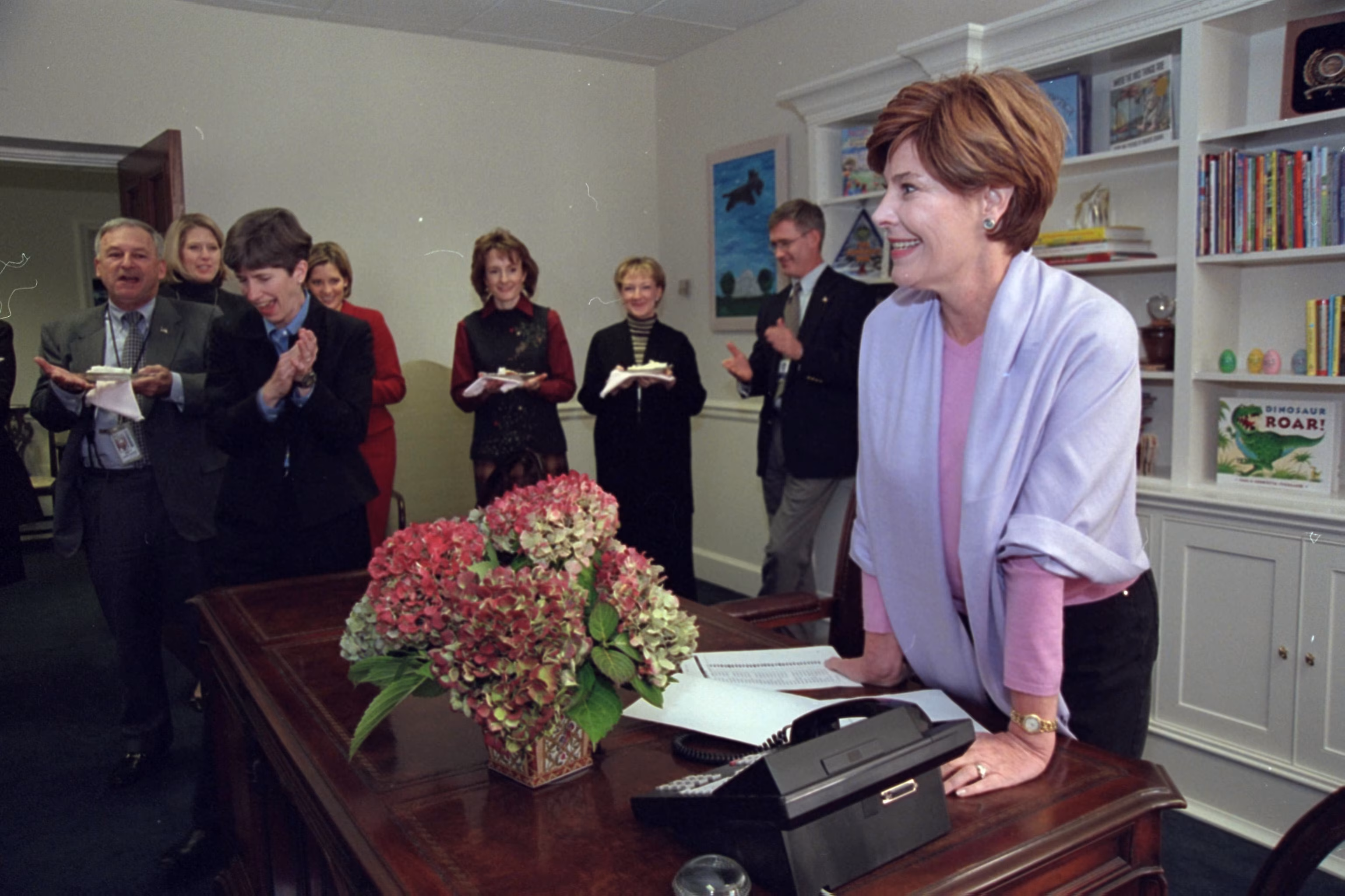 In this Nov. 5, 2001, file photo, First Lady Laura Bush celebrates her birthday with White House staff members in the East Wing of the White House.National Archives