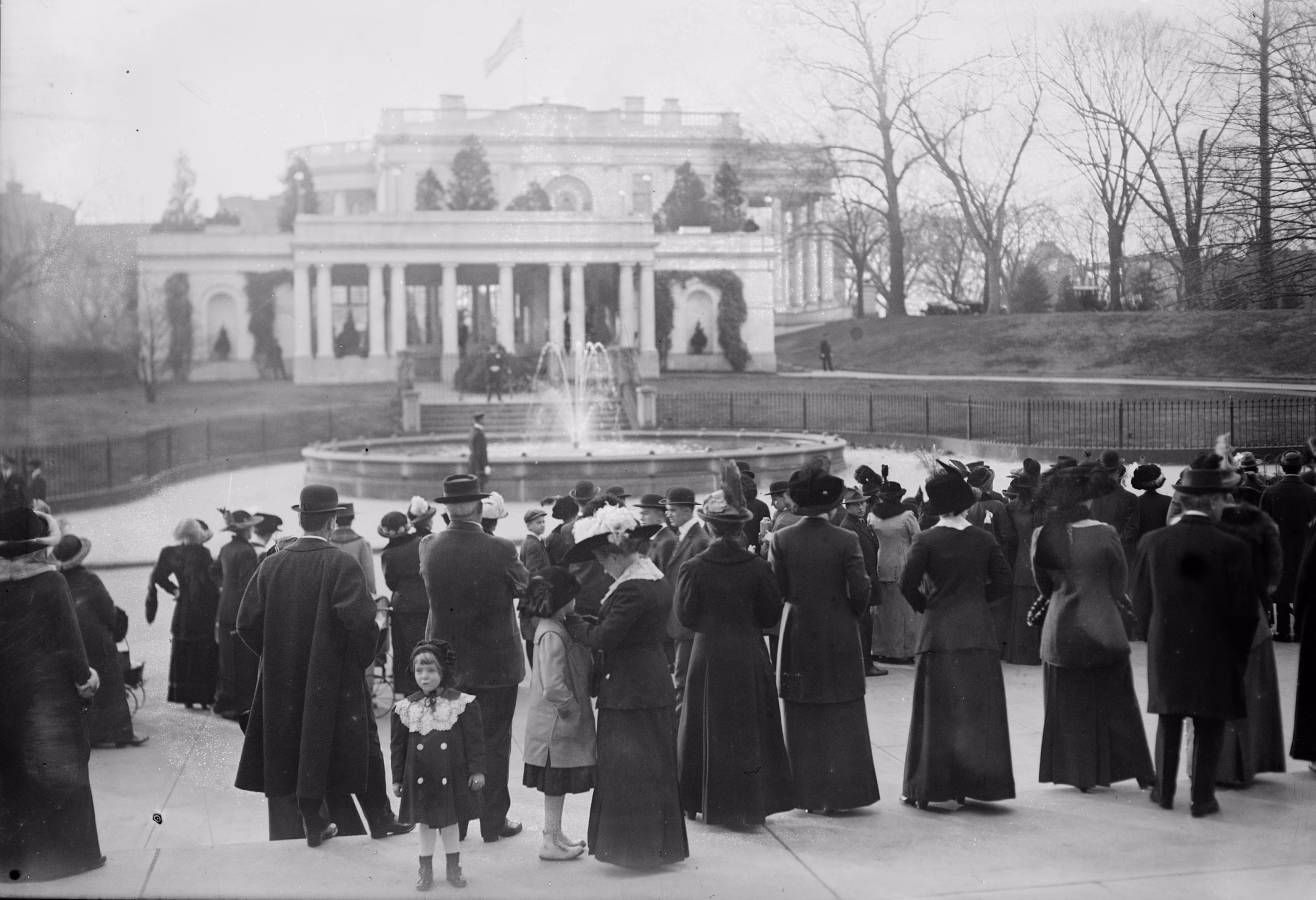 This photograph provided by the U.S. Library of Congress shows a crowd outside the White House on the wedding day of Jessie Woodrow Wilson, daughter of President Wilson in a White House ceremony in Washington, Nov. 25, 1913.U.S. Library of Congress via AP