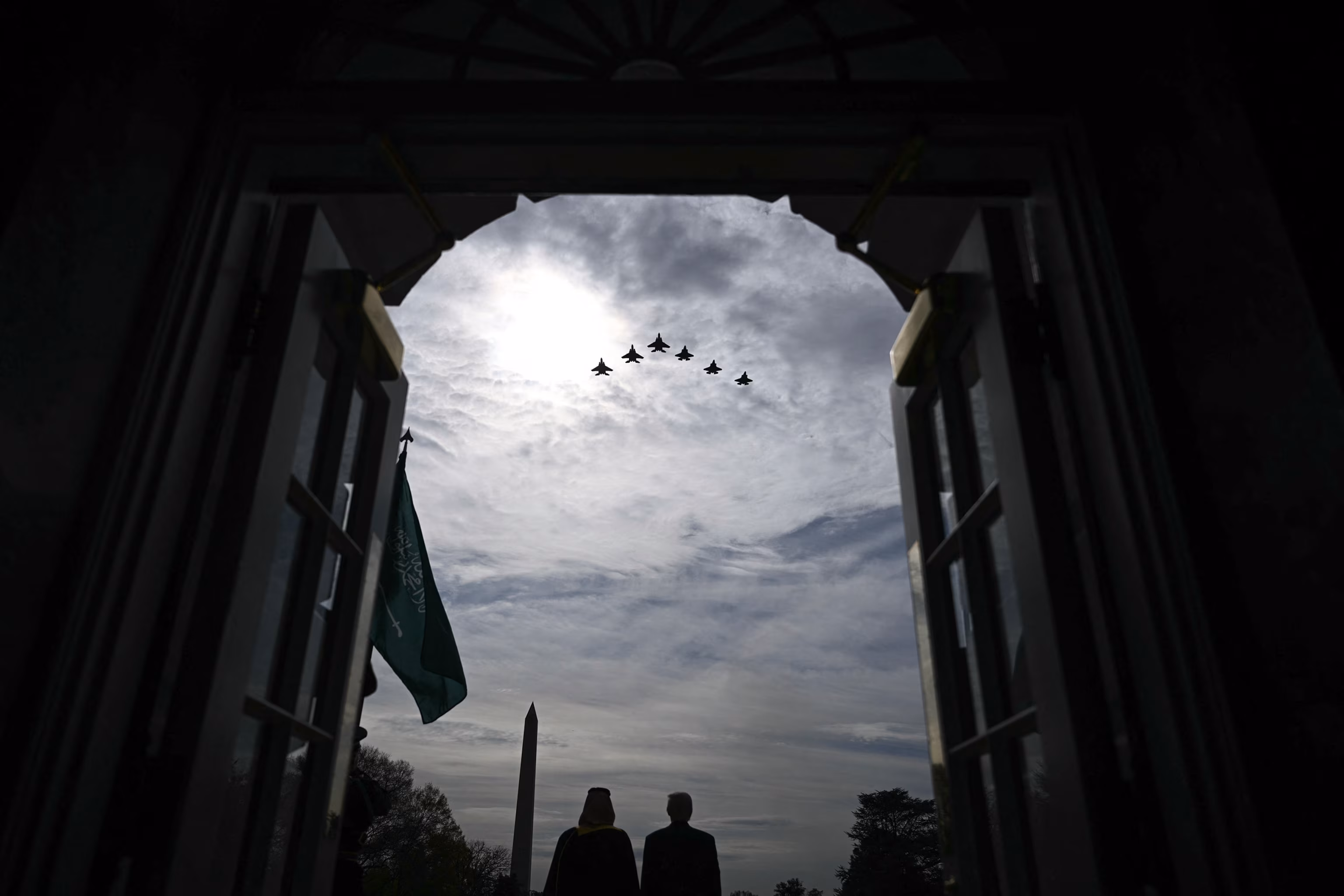 Crown Prince and Prime Minister Mohammed bin Salman of Saudi Arabia and President Donald Trump observe a military aerial display as bin Salman arrives at the White House, November 18, 2025 in Washington.Brendan Smialowski/AFP via Getty Images