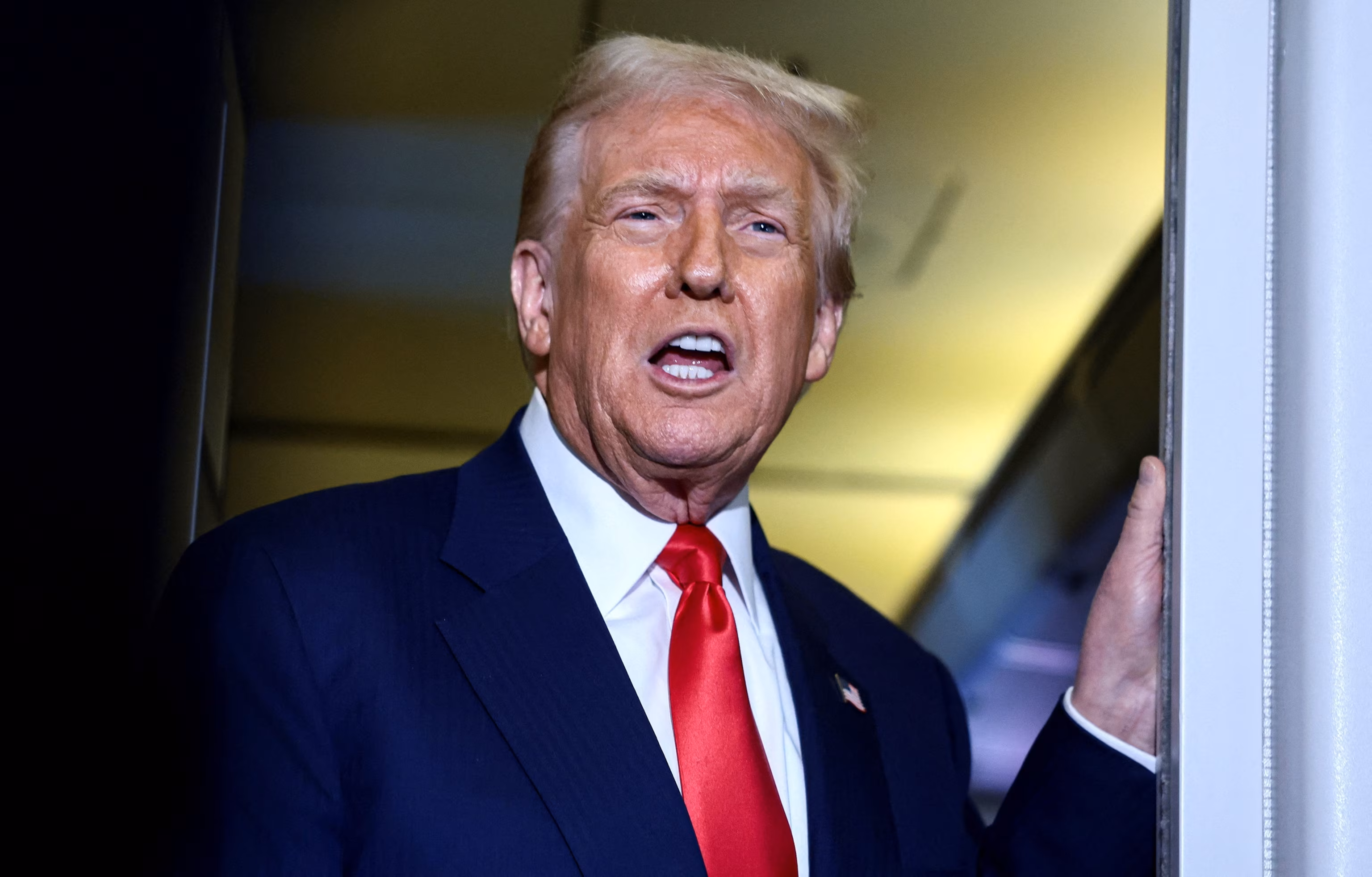 President Donald Trump speaks with reporters aboard Air Force One shortly after taking off from Busan, South Korea, en route to Joint Base Andrews, Md., Oct. 30, 2025.Evelyn Hockstein/Reuters