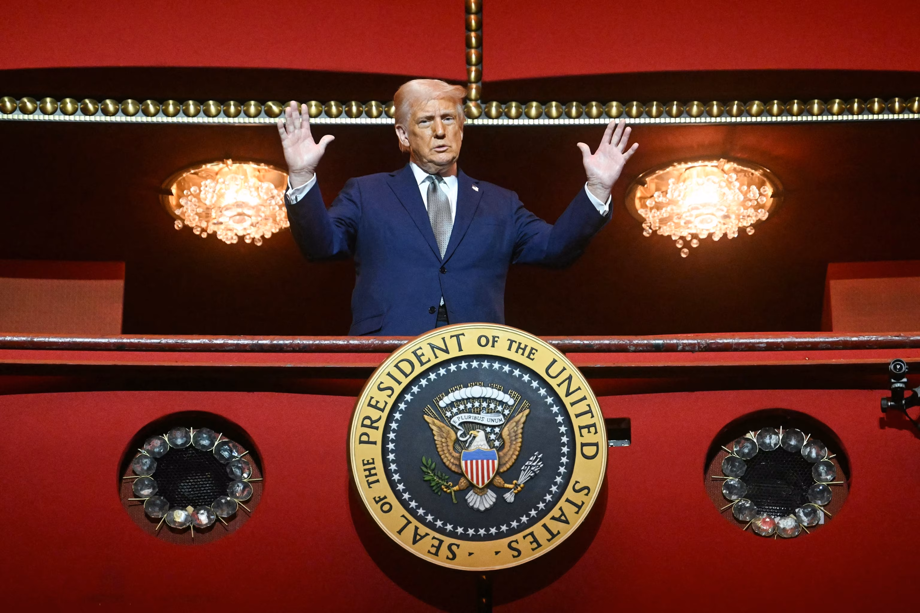 President Donald Trump stands in the presidential box as he tours the John F. Kennedy Center for the Performing Arts in Washington, D.C., on March 17, 2025. Jim Watson/AFP via Getty Images