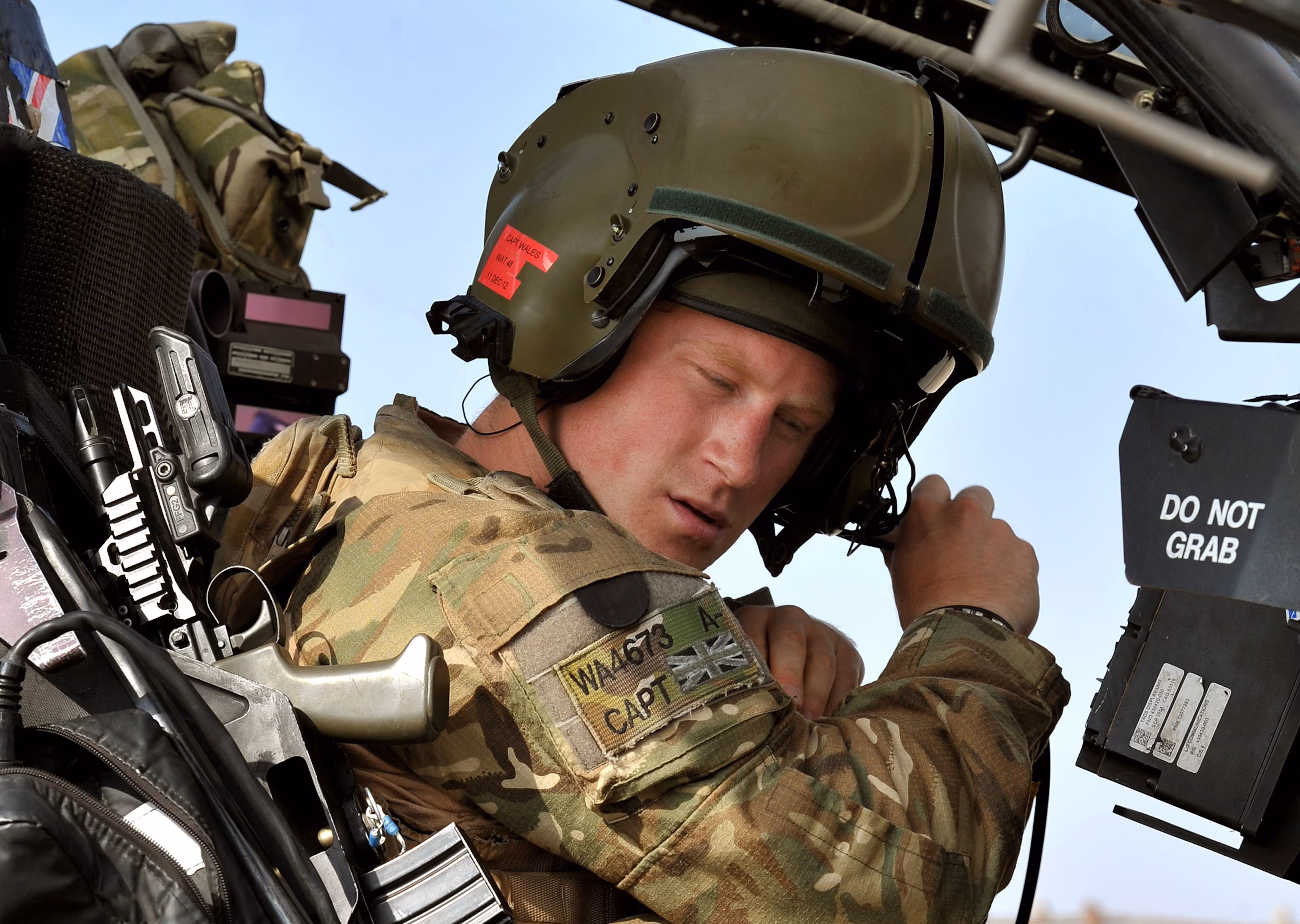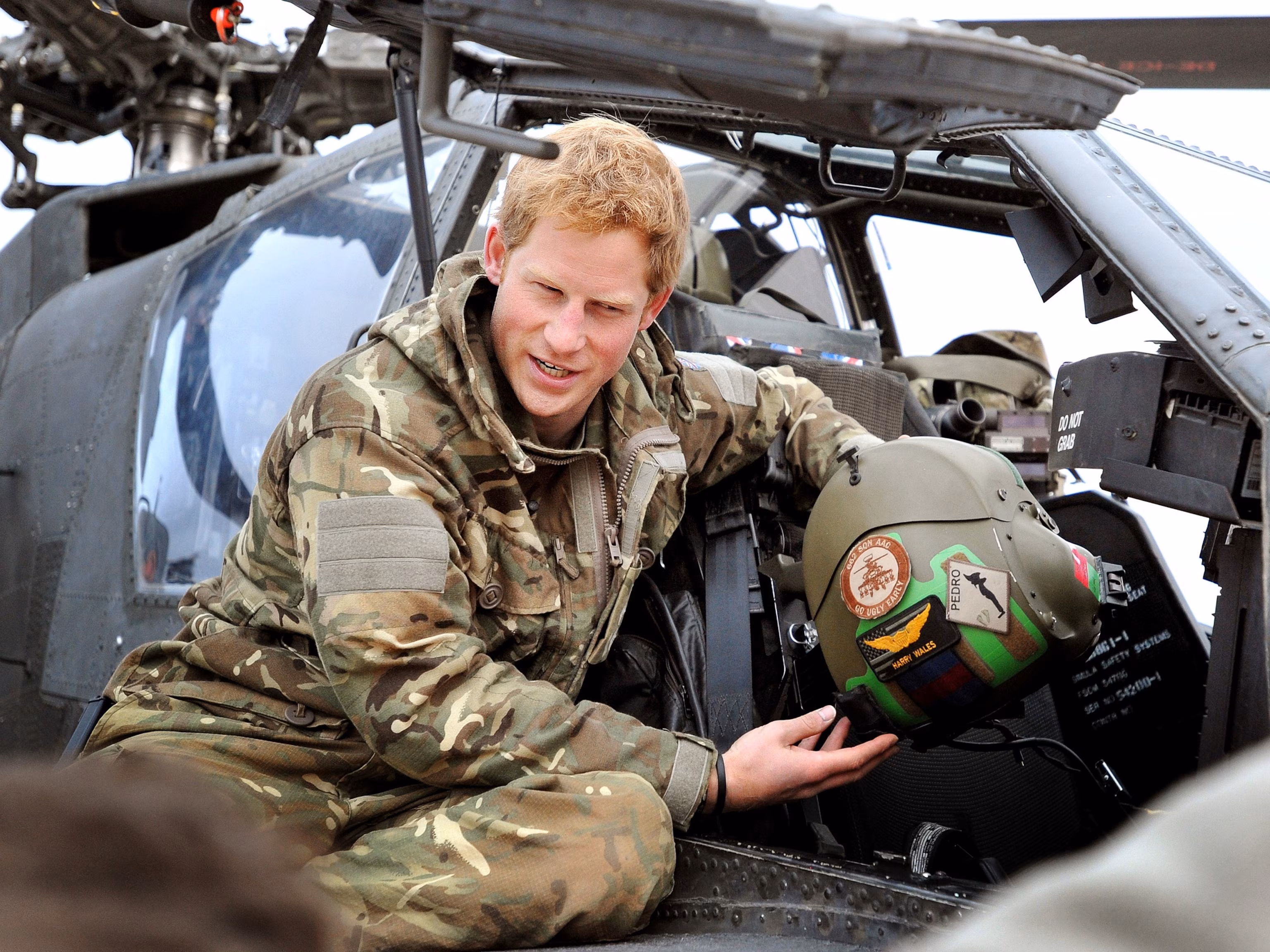 Britain’s Prince Harry shows off his flight helmet as he makes his early morning pre-flight checks at the British controlled flight-line at Camp Bastion in Afghanistan’s Helmand Province, December 12, 2012.John Stillwell/AFP via Getty Images