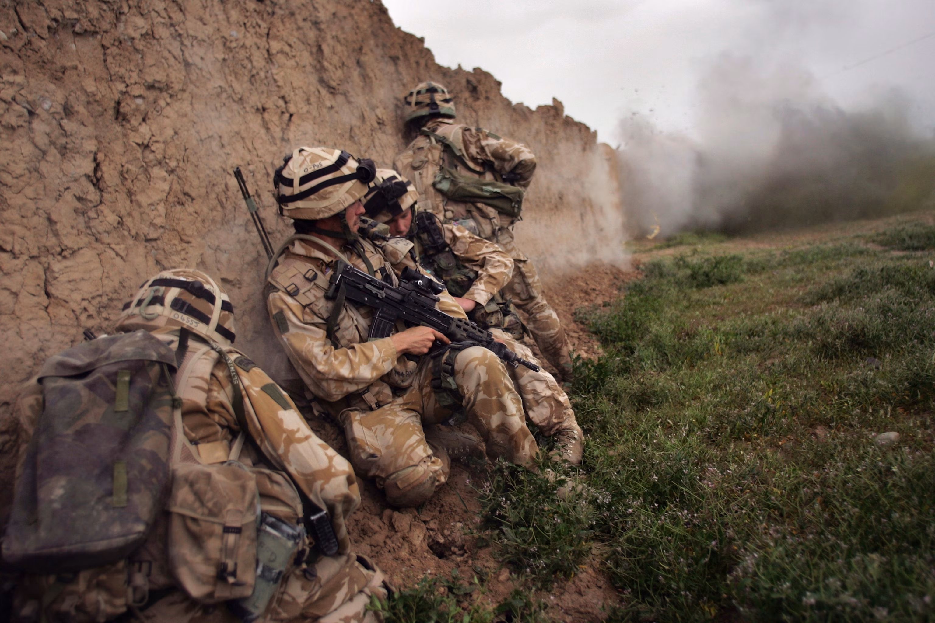 British Marines take cover while blasting a whole in a wall during an anti-Taliban operation near Kajaki in the Afghan province of Helmand, March 18, 2007.John Moore/Getty Images