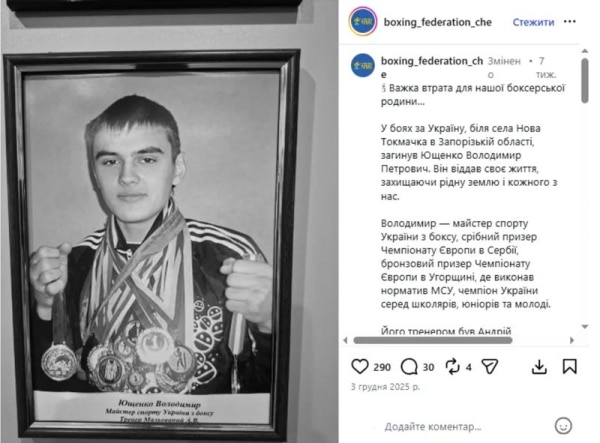 Another representative of Ukrainian sports has died in the war against the Russian occupiers. Ukrainian boxing champion Volodymyr Yushchenko was killed in fighting near the village of Nova Tokmachka in the Zaporizhia region, the NOC of Ukraine reported.